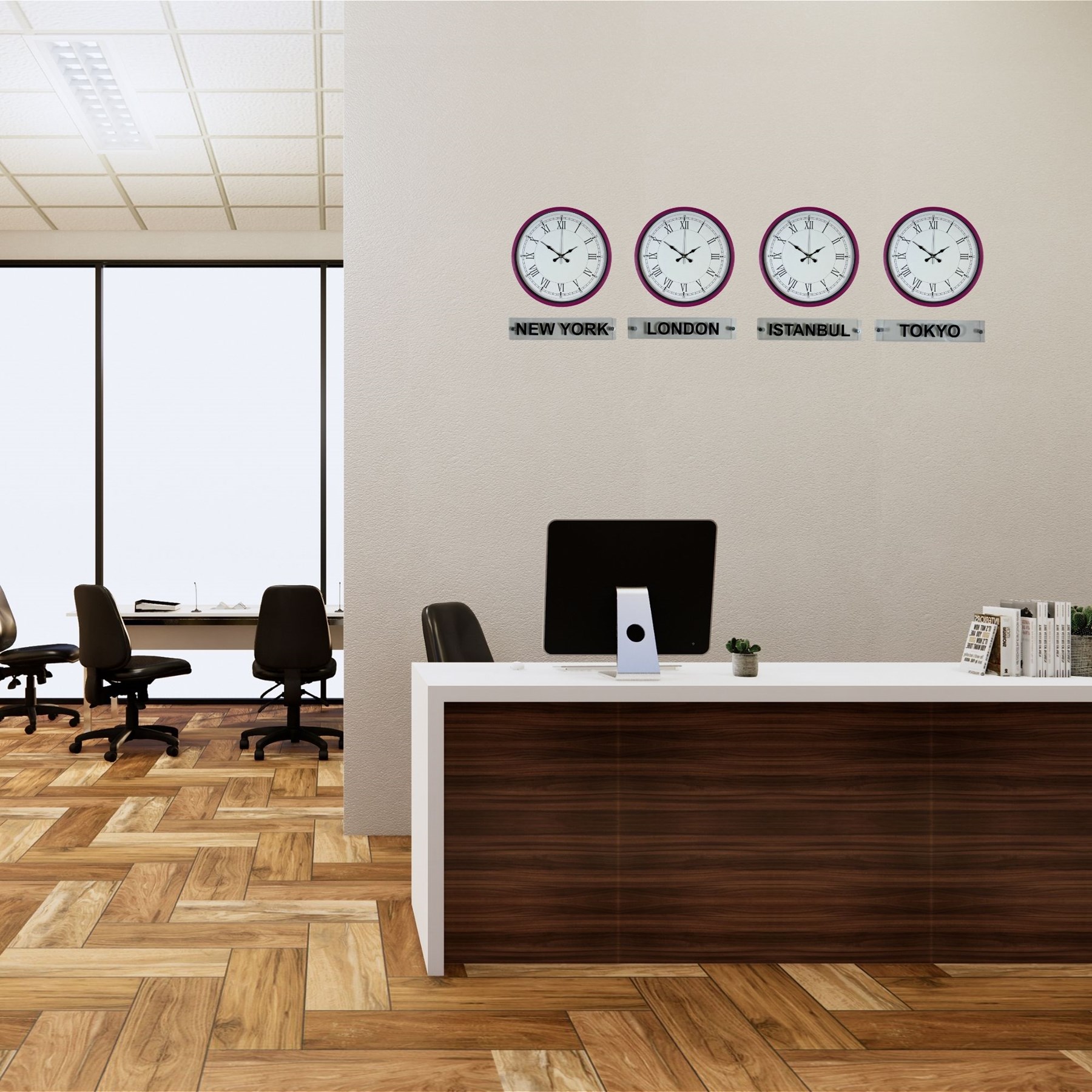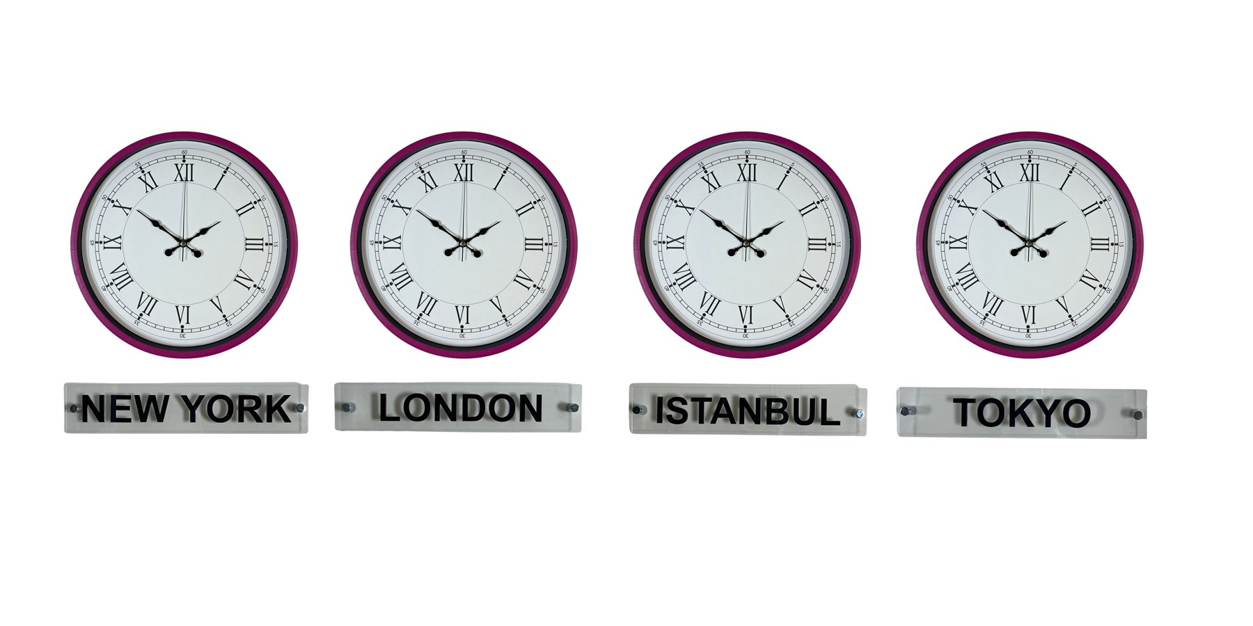 Canlı ve dikkat çekici tasarımıyla öne çıkan 36 cm 4’lü plastik tabelalı pembe dünya saatleri, bulunduğu ortama modern ve enerjik bir görünüm kazandırır. New York, London, Istanbul ve Tokyo saatlerini aynı anda takip etme imkânı sunan bu özel set; özellikle ofisler, resepsiyon alanları ve çalışma ortamları için hem dekoratif hem de işlevsel bir çözümdür.