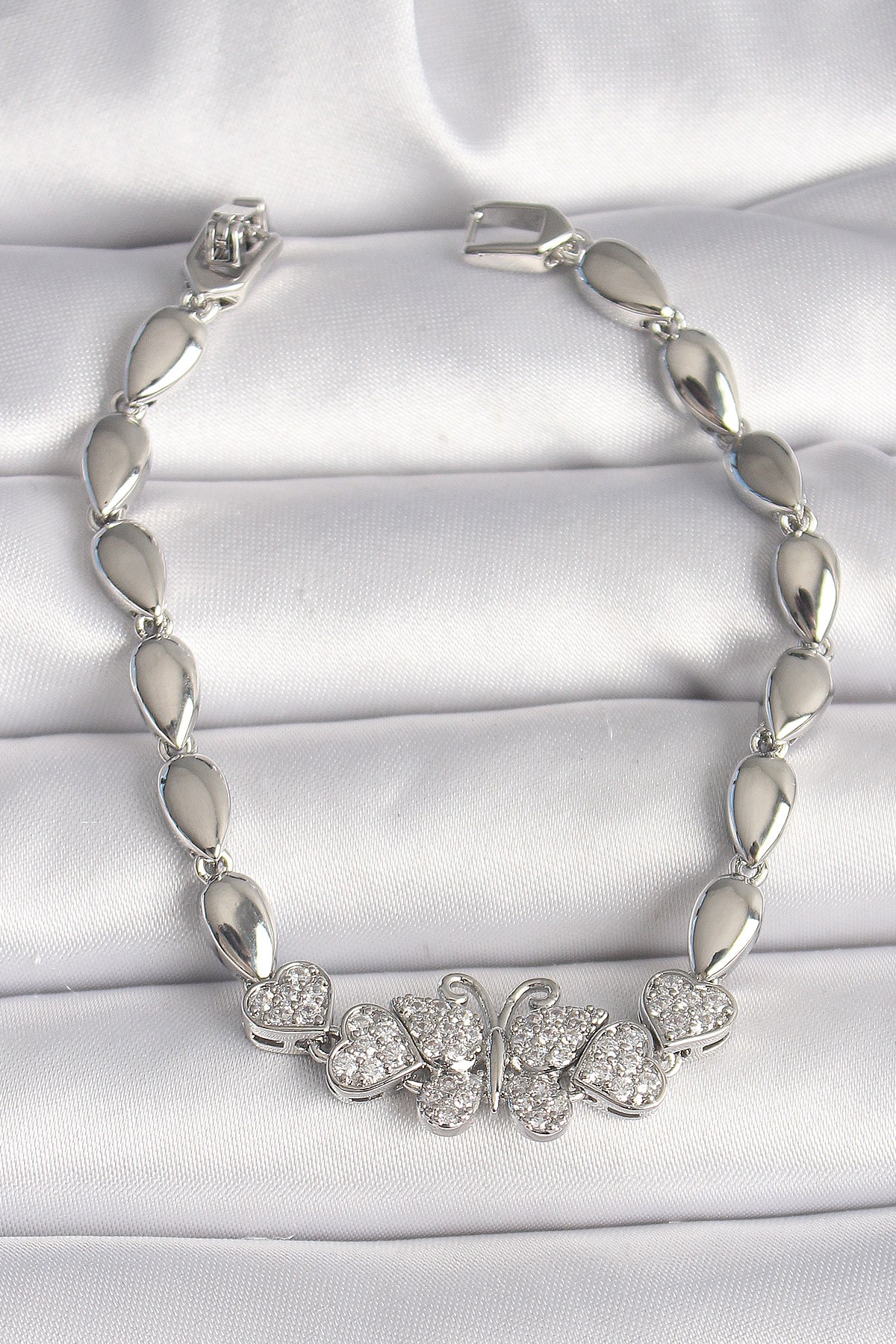 Pirinç Gümüş Renk Zirkon Taşlı Kelebek Figür Damla Zincir Model Kadın Bileklik
