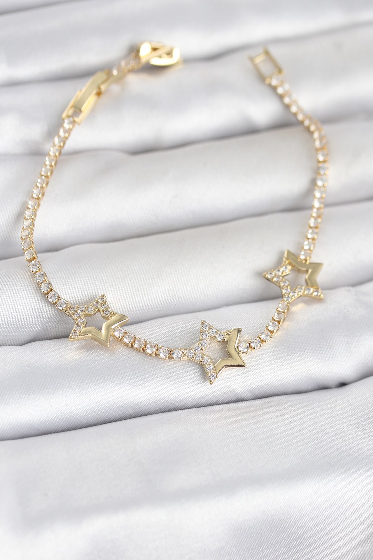 Pirinç Gold Renk Yıldız Model Zirkon Taşlı Su Yolu Kadın Bileklik