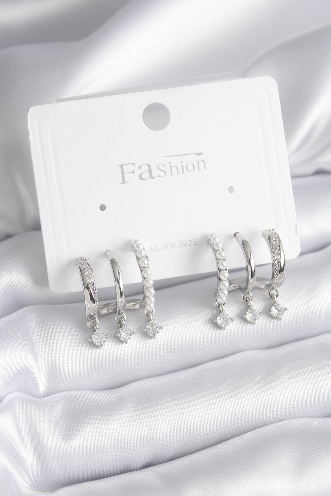 Pirinç Gümüş Renk Zirkon Taş Detay İncili Kadın Küpe