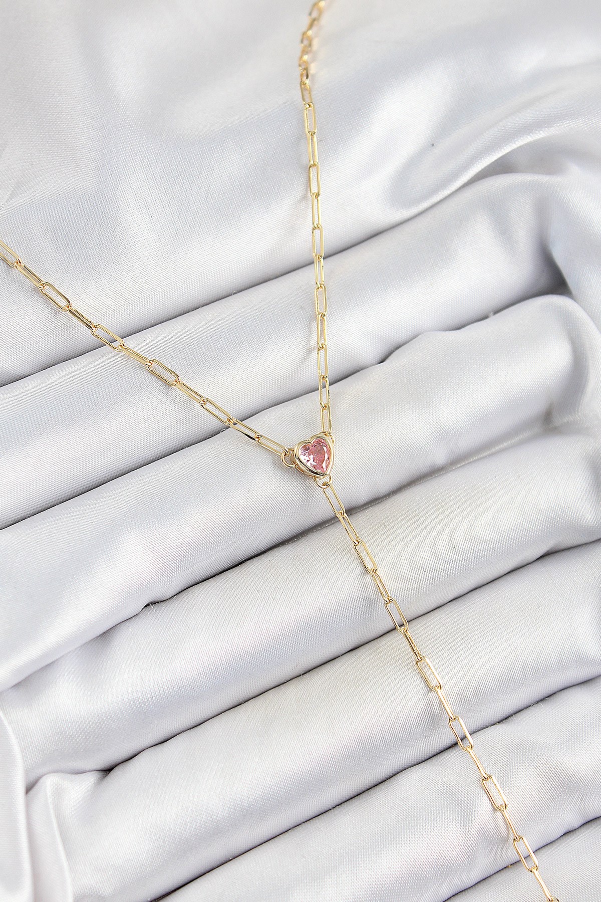 Pirinç Zirkon Taşlı Pembe Kalp Figürlü Y Model Gold Renk Kadın Kolye