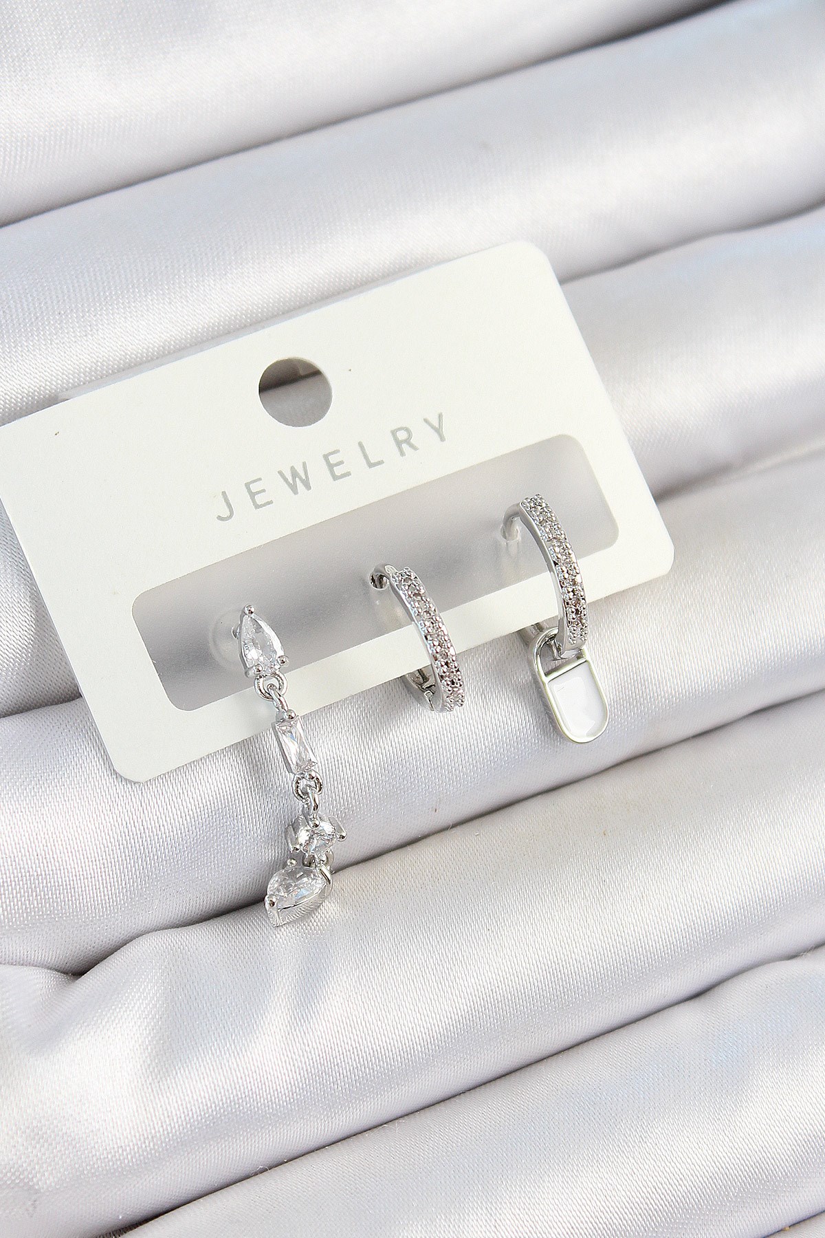 Pirinç Zirkon Taşlı Sallantılı Model Gümüş Renk 3'lü Çift Kadın Küpe Set