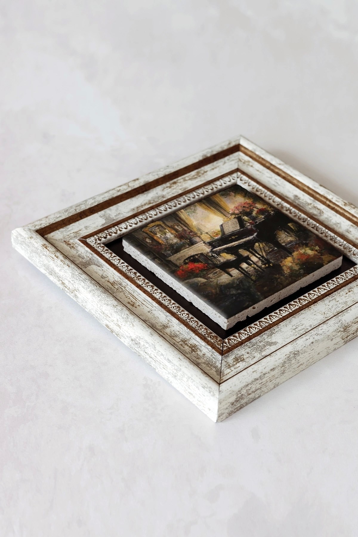 Ürün hakkında: Ölçüleri: 20 cm x 20 cm'dir. ; Kalınlık :2,5 cm'dir. ; Ürünün arka tarafında askı aparatı bulunmaktadır. ; Kullanılan çerçeveler yüksek kaliteli, eskitme görünümlü kompozit malzemeden üretilmiştir. ; Taşların yüzeyindeki baskı teknolojisi özel olup sağlığa hiçbir zararı yoktur. ; Kullanılan malzeme dağdan çıkan gerçek taş oldugu için yüzeyinde belli oranda gözenek bulunması ve renginin krem renginin tonlarını barındırması normaldir kimyasal malzeme teması Yüzey deformasyona maruz kalabilir. ; Nemli bezle silinerek temizlenebilir. ; Isıya, suya ve neme dayanıklıdır. ; Kutu içeriği: Orijinal kutu içerisinde 1 adet çerçeveli taş duvar dekoru. ; 1 adet çerçeveli duvar dekoru ağırlığı: 250 gr çerçeve askısı ile duvara montajı yapılabilir.;