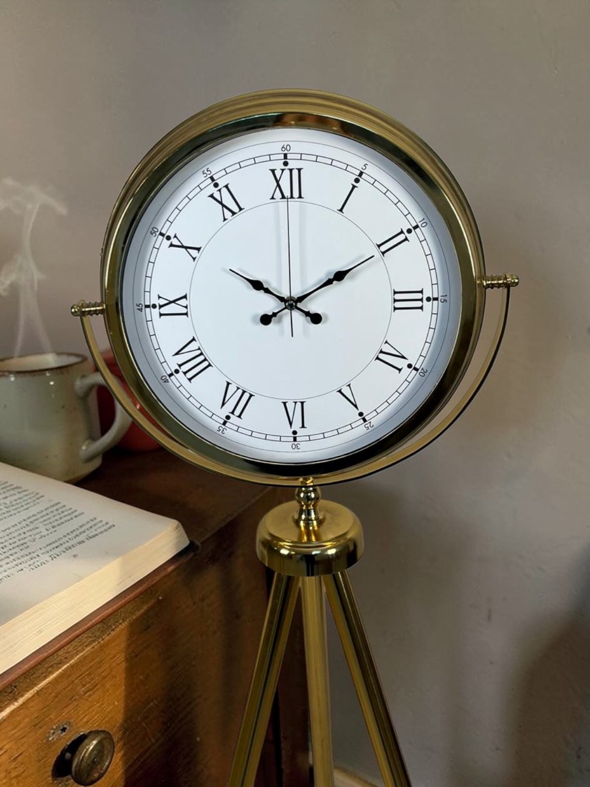 Zarif ve klasik tasarımıyla öne çıkan Gold Tripod Ayaklı Dekoratif Salon Saati, gold metal tripod ayak yapısı ve şık Roma rakamlı kadranı ile yaşam alanlarınıza estetik bir dokunuş kazandırır. Modern tripod tasarımı ile klasik saat görünümünü bir araya getiren bu model, salon, ofis, otel lobisi ve çalışma alanlarında dikkat çekici bir dekoratif ürün olarak kullanılabilir.