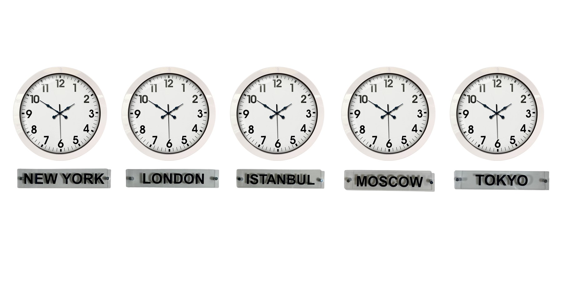 Ofisler, oteller, resepsiyon alanları ve çalışma ortamları için özel olarak tasarlanan bu set; New York, London, Istanbul, Moscow ve Tokyo şehirlerini aynı anda takip etmenizi sağlar. Alt kısmında yer alan şeffaf tabelalar ürüne kurumsal ve global bir kimlik kazandırır.