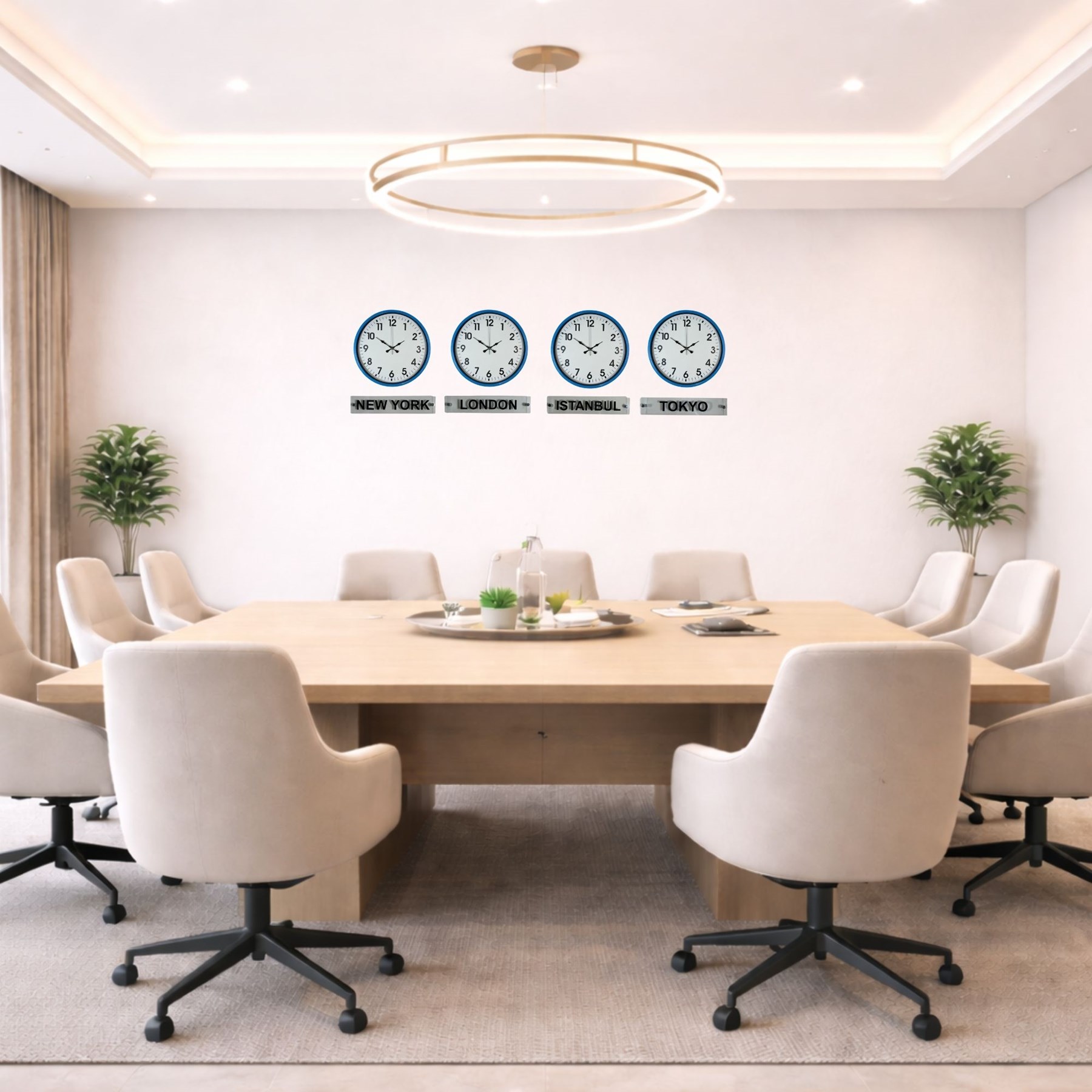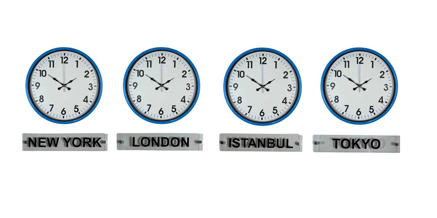 Canlı ve dikkat çekici rengiyle öne çıkan 36 cm 4’lü plastik tabelalı mavi dünya saatleri, bulunduğu ortama modern ve enerjik bir hava katar. New York, London, Istanbul ve Tokyo saatlerini aynı anda takip etmenizi sağlayan bu özel set; ofisler, oteller, resepsiyon alanları ve çalışma ortamları için hem dekoratif hem de fonksiyonel bir çözümdür.