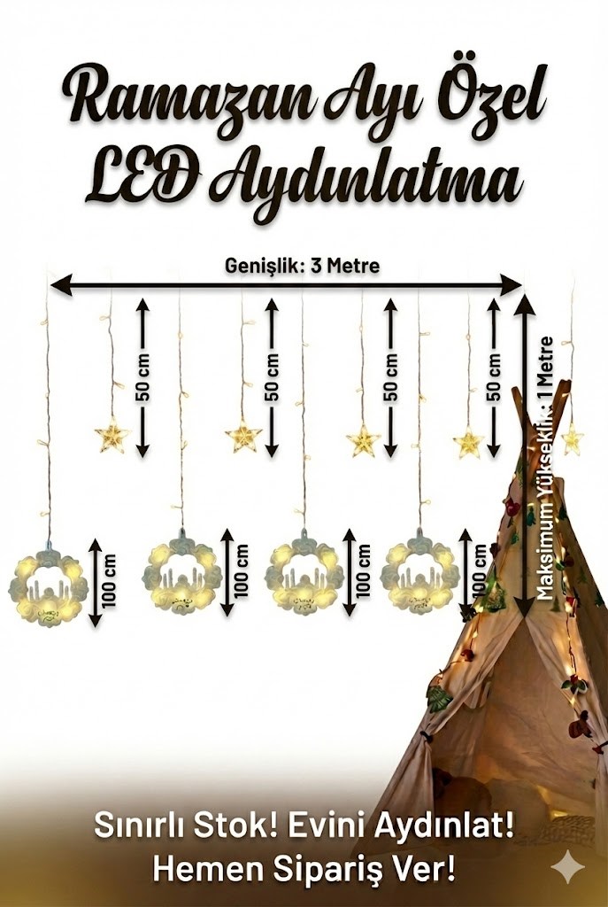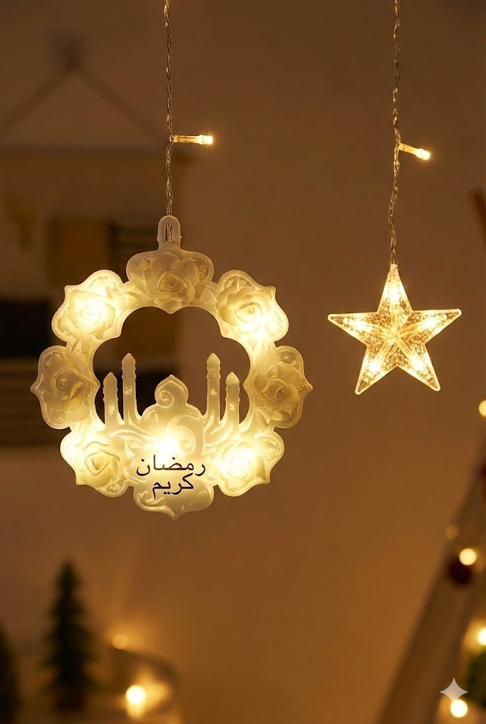 Ev ve yaşam alanlarınıza şık ve anlamlı bir atmosfer katmak için tasarlanan perde LED ışık, Ramazan ve özel gün dekorasyonları için ideal bir tercihtir. Yıldız ve ay–cami figürlerinin zarif uyumu sayesinde hem klasik hem de modern dekorasyonlarla mükemmel uyum sağlar.