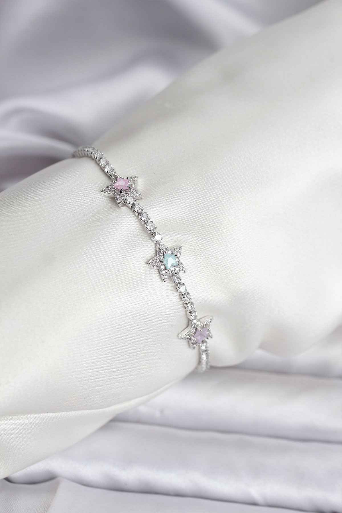 Renkli Yıldız Model Zirkon Taşlı Gümüş Renk Pirinç Su Yolu Kadın Bileklik