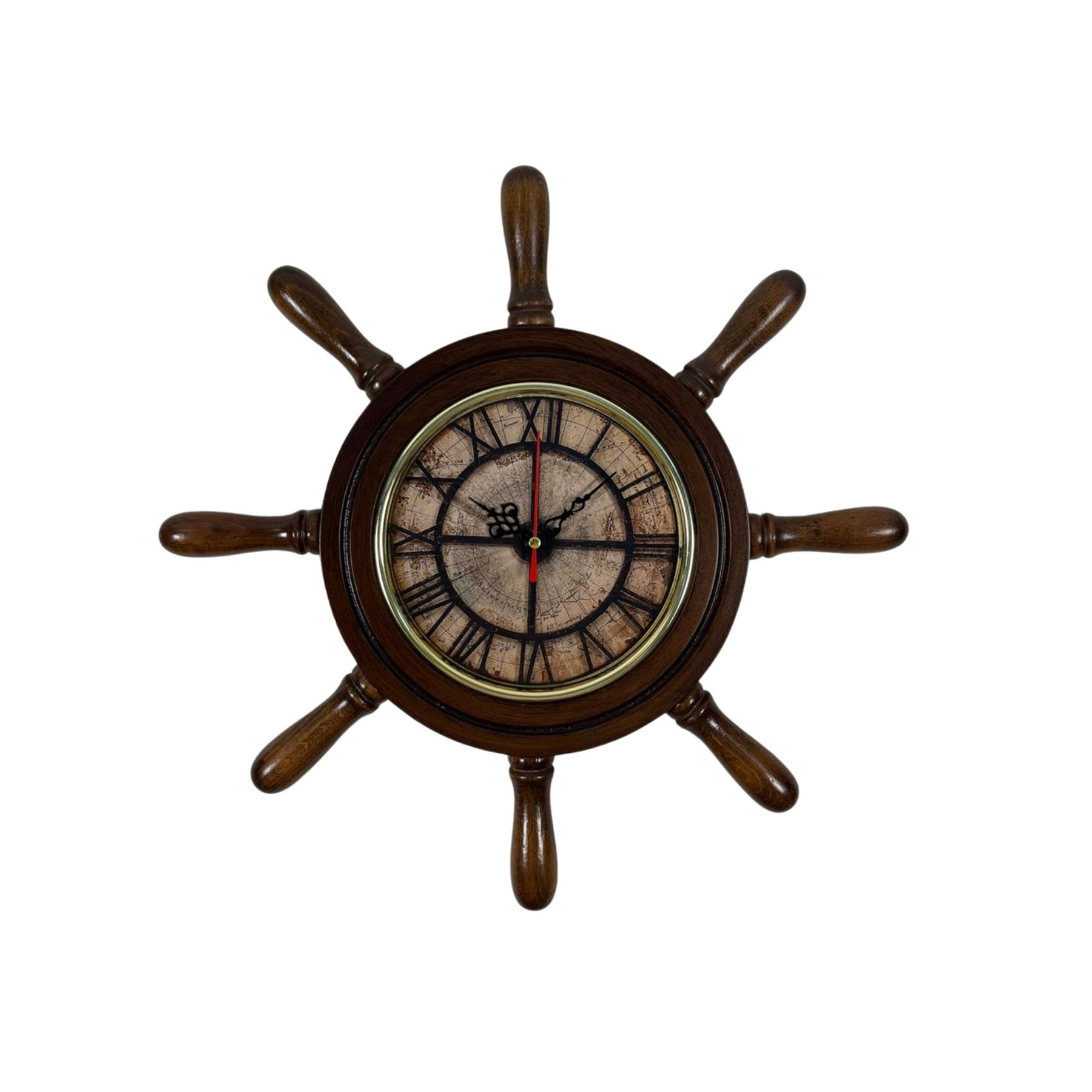 Saatin etrafında bulunan dümen kolları (kavelalar), gerçek bir gemi dümenini andıran detaylı bir tasarıma sahiptir. Bu kavelalar 8 cm uzunluğunda olup saatin marin karakterini güçlendiren estetik bir görünüm sunar. Saat kısmının çapı ise 37 cm olup duvar üzerinde dengeli ve dikkat çekici bir ölçü sunar.