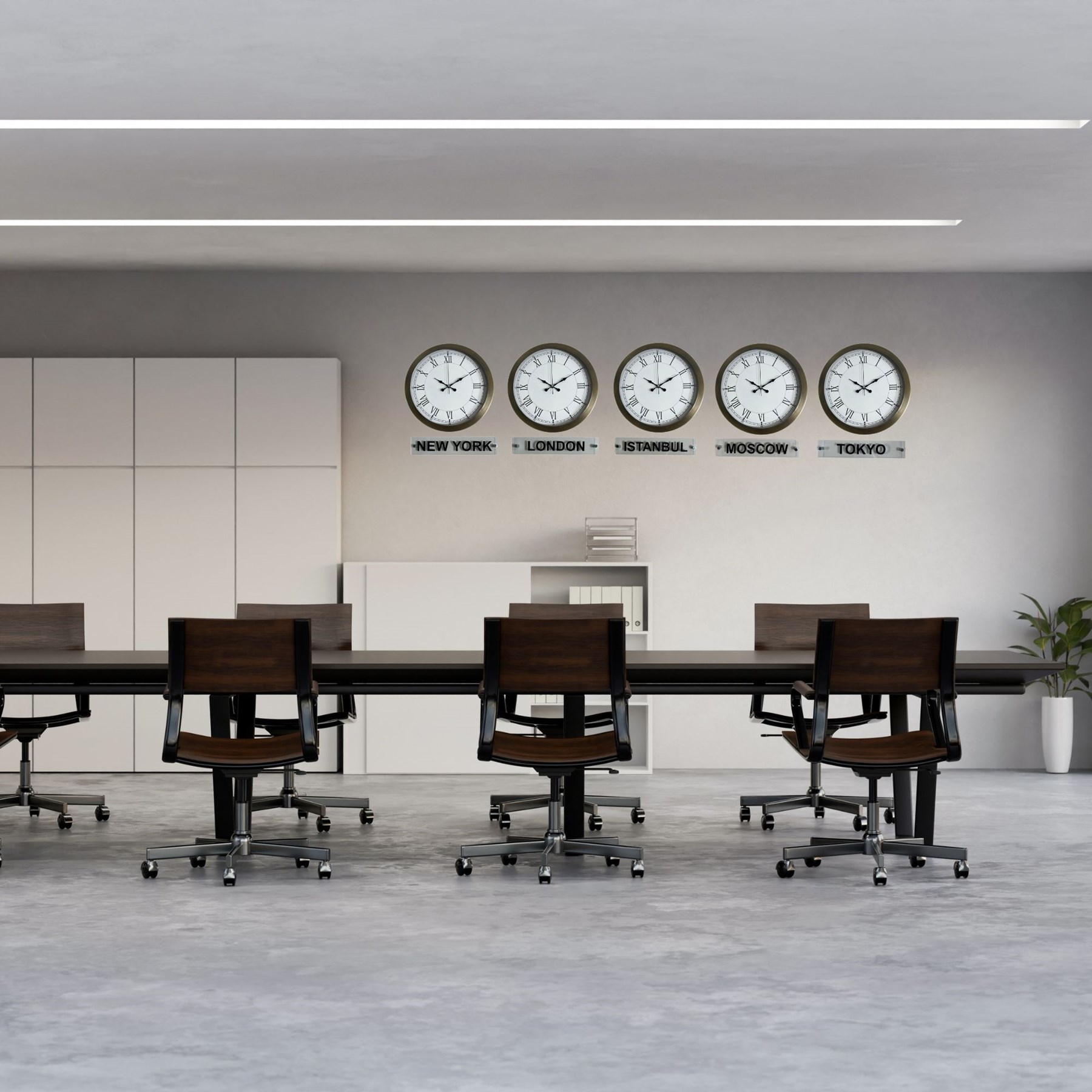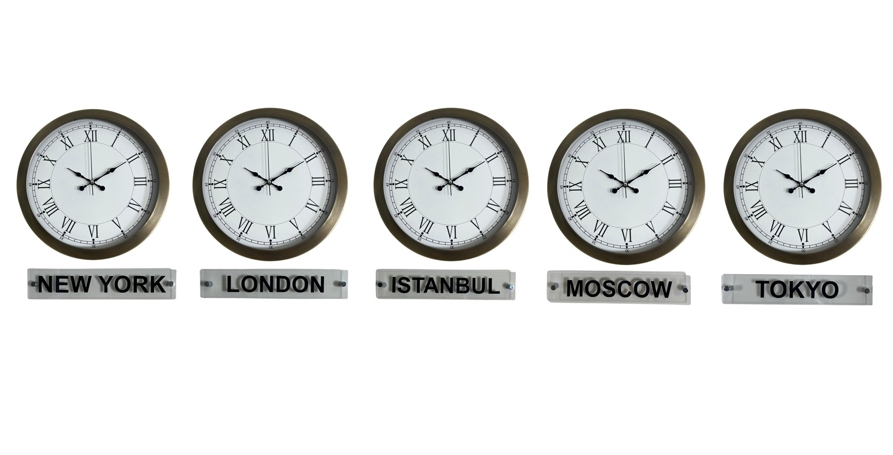 Farklı şehirlerin saat dilimlerini tek noktadan takip etmenizi sağlayan bu model; New York, London, Istanbul, Moscow ve Tokyo saatlerini aynı anda gösterir. Alt kısmında yer alan şeffaf tabelalar, ürüne kurumsal ve global bir kimlik kazandırarak özellikle ofis, otel ve resepsiyon alanları için ideal bir görünüm sunar.
