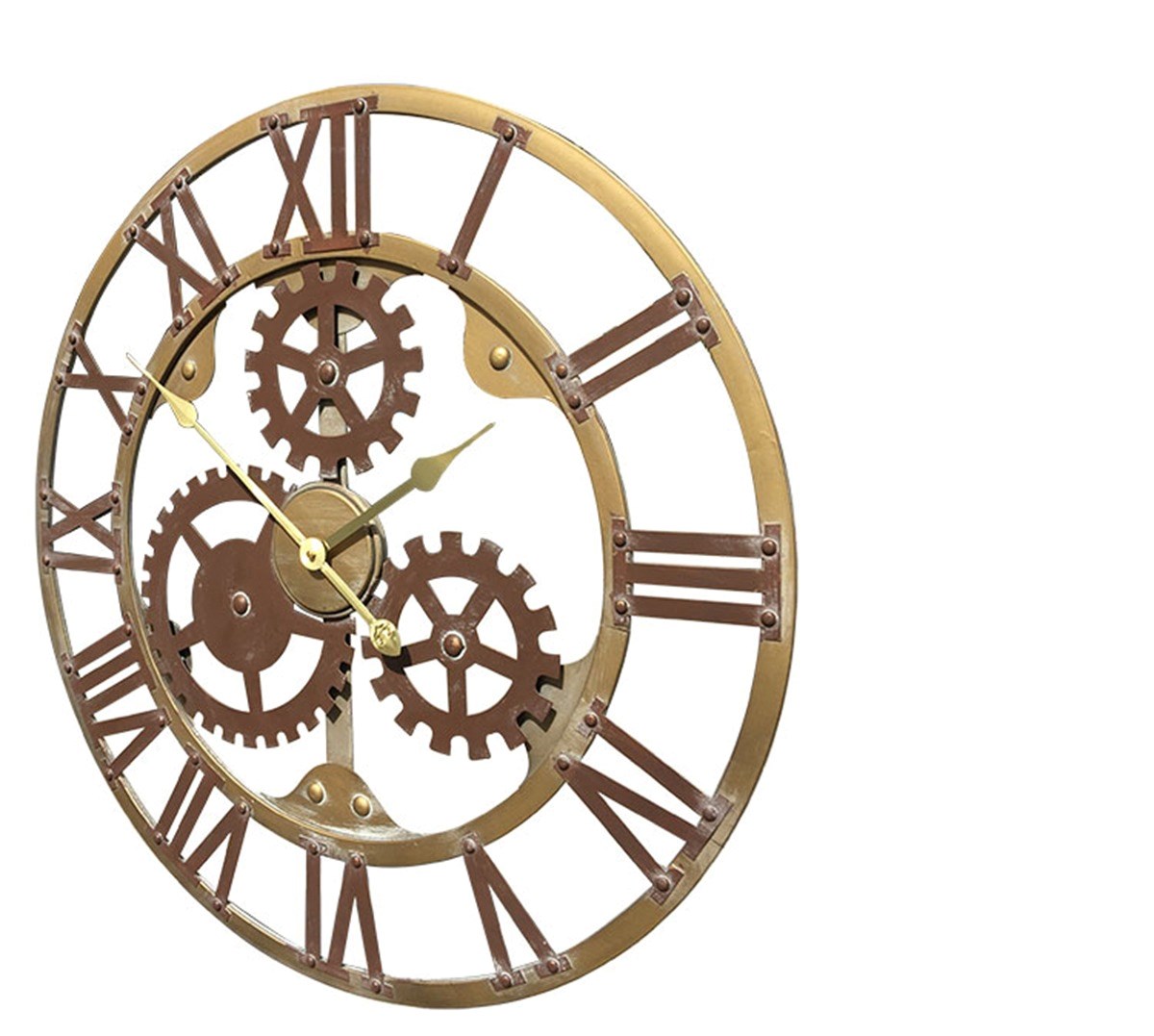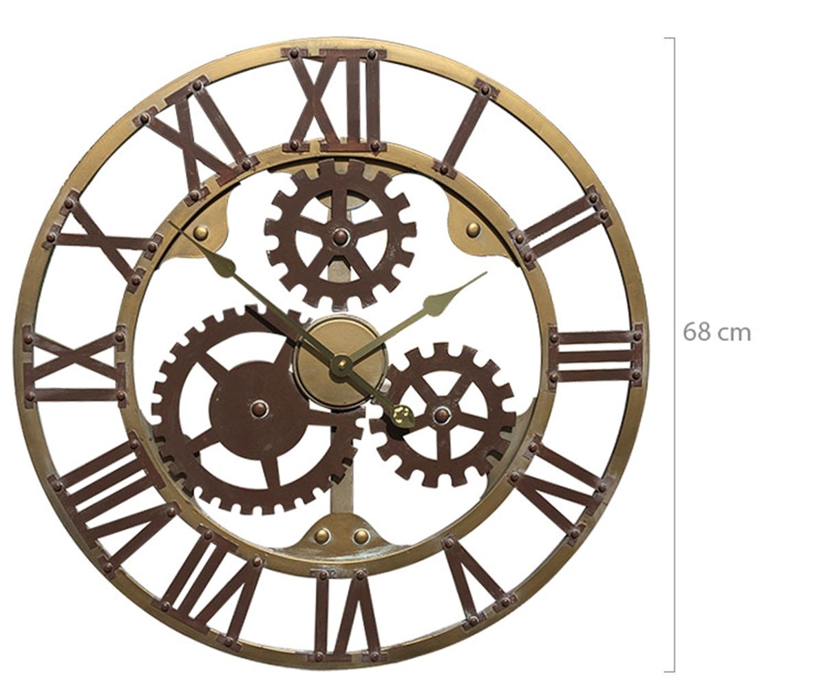 Etkileyici 68 cm çapı ve hareketli çark tasarımıyla bu duvar saati, bulunduğu ortama güçlü bir karakter kazandırır. Roma rakamlı dış çerçevesi ve eskitme metal görünümü sayesinde vintage ve endüstriyel dekorasyon tarzına mükemmel uyum sağlar.