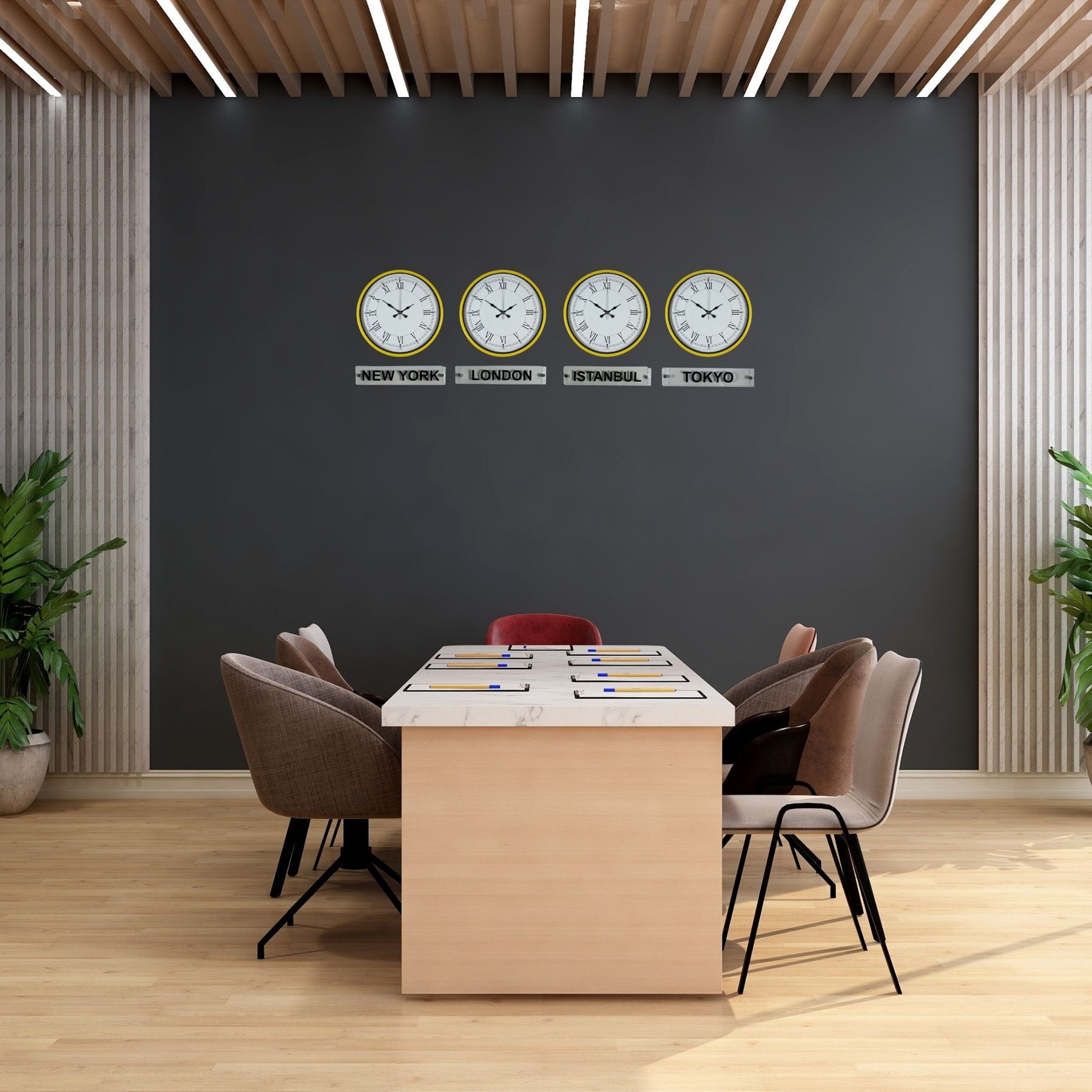 Modern ve enerjik tasarımıyla öne çıkan 36 cm 4’lü plastik tabelalı sarı dünya saatleri, bulunduğu ortama canlılık ve dinamizm katar. New York, London, Istanbul ve Tokyo saatlerini aynı anda takip edebilmenizi sağlayan bu özel set; ofisler, resepsiyon alanları ve çalışma ortamları için hem dekoratif hem de fonksiyonel bir çözümdür.