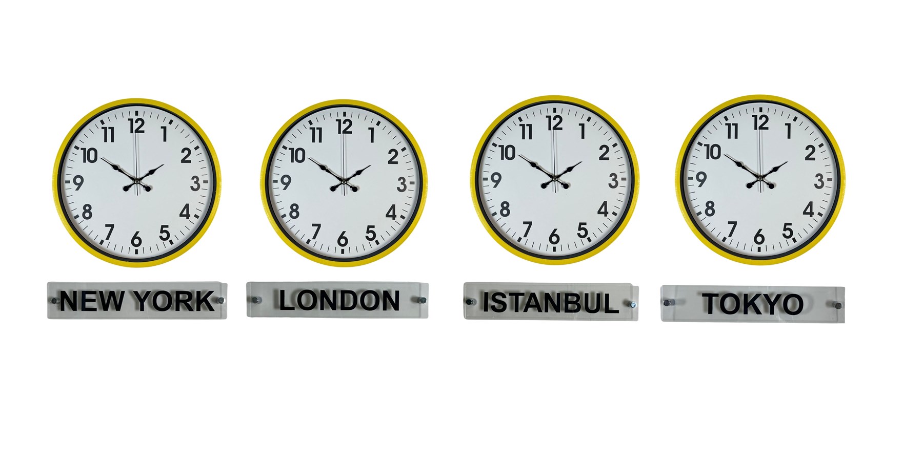 Canlı ve enerjik tasarımıyla dikkat çeken 36 cm 4’lü plastik tabelalı sarı dünya saatleri, bulunduğu ortama modern ve dinamik bir hava kazandırır. New York, London, Istanbul ve Tokyo saatlerini aynı anda takip etmenizi sağlayan bu özel set; ofisler, resepsiyonlar ve çalışma alanları için hem dekoratif hem de fonksiyonel bir çözümdür.
