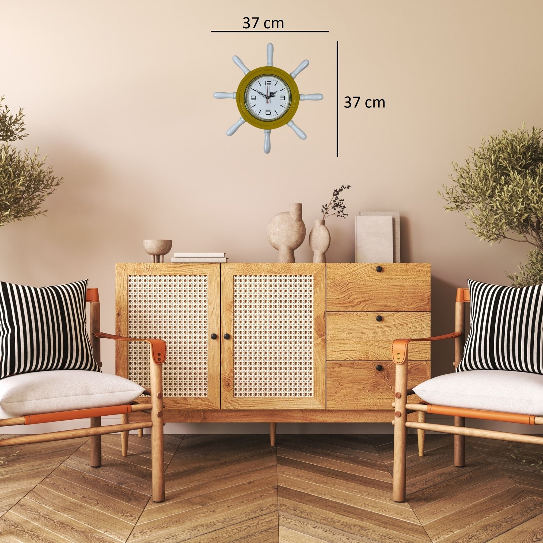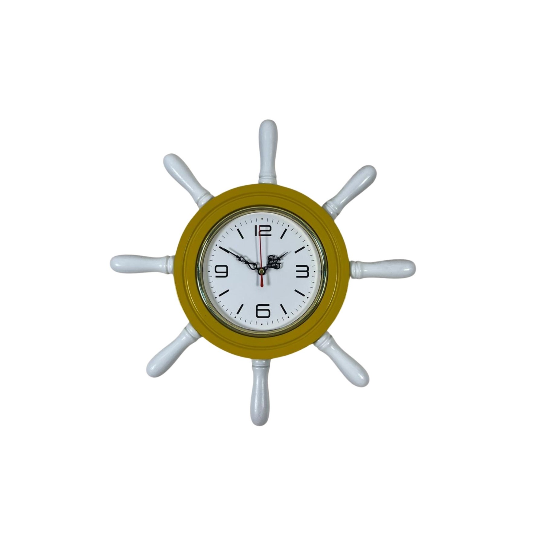 Denizcilik temalı dekorasyonlardan ilham alınarak tasarlanan 37 cm Sarı Dümen Duvar Saati, bulunduğu ortama canlı ve enerjik bir marin atmosfer kazandırır. Gemi dümeni formundaki özgün tasarımı sayesinde özellikle çocuk odası, genç odası, salon, yazlık ev ve deniz temalı dekorasyonlar için dikkat çekici bir duvar saatidir.