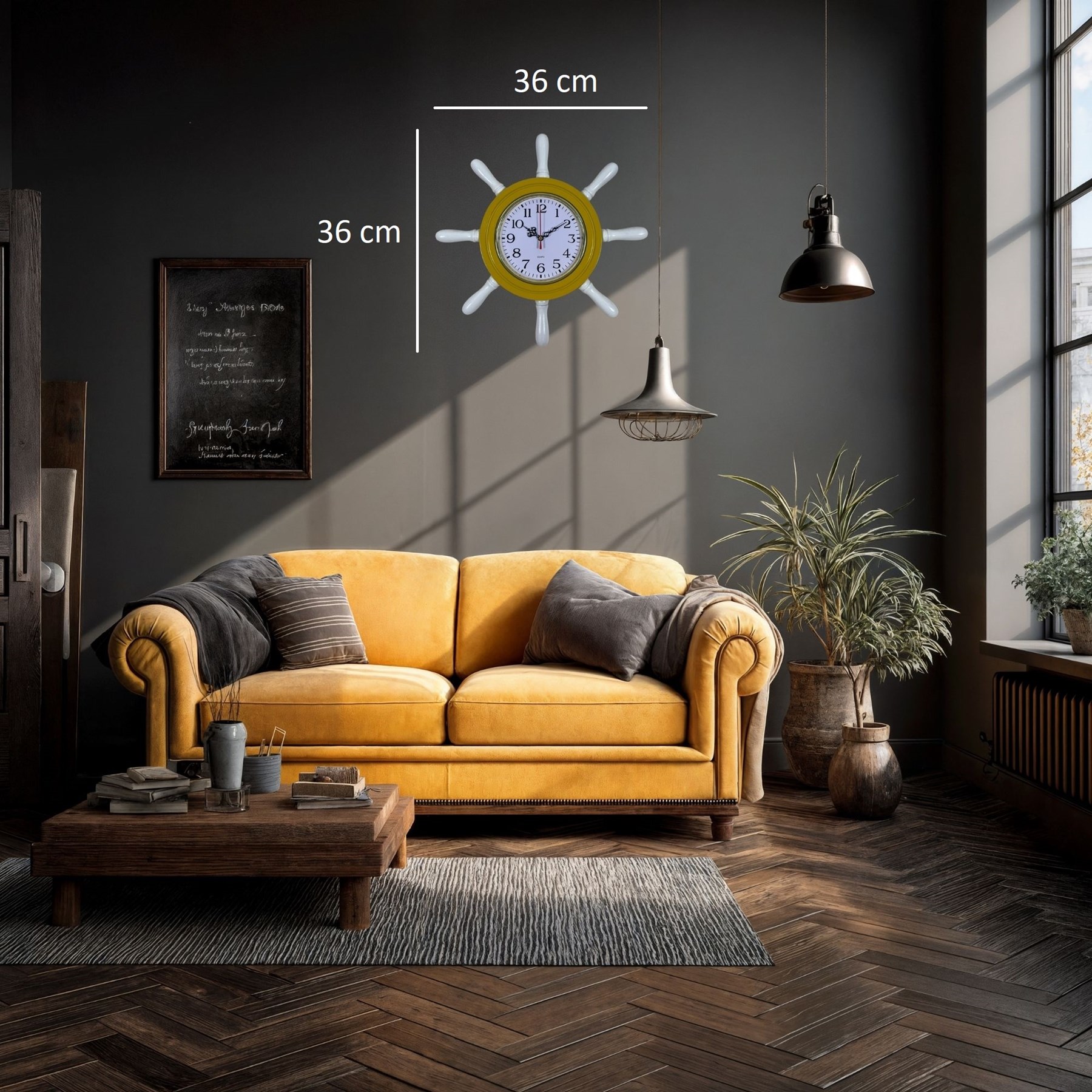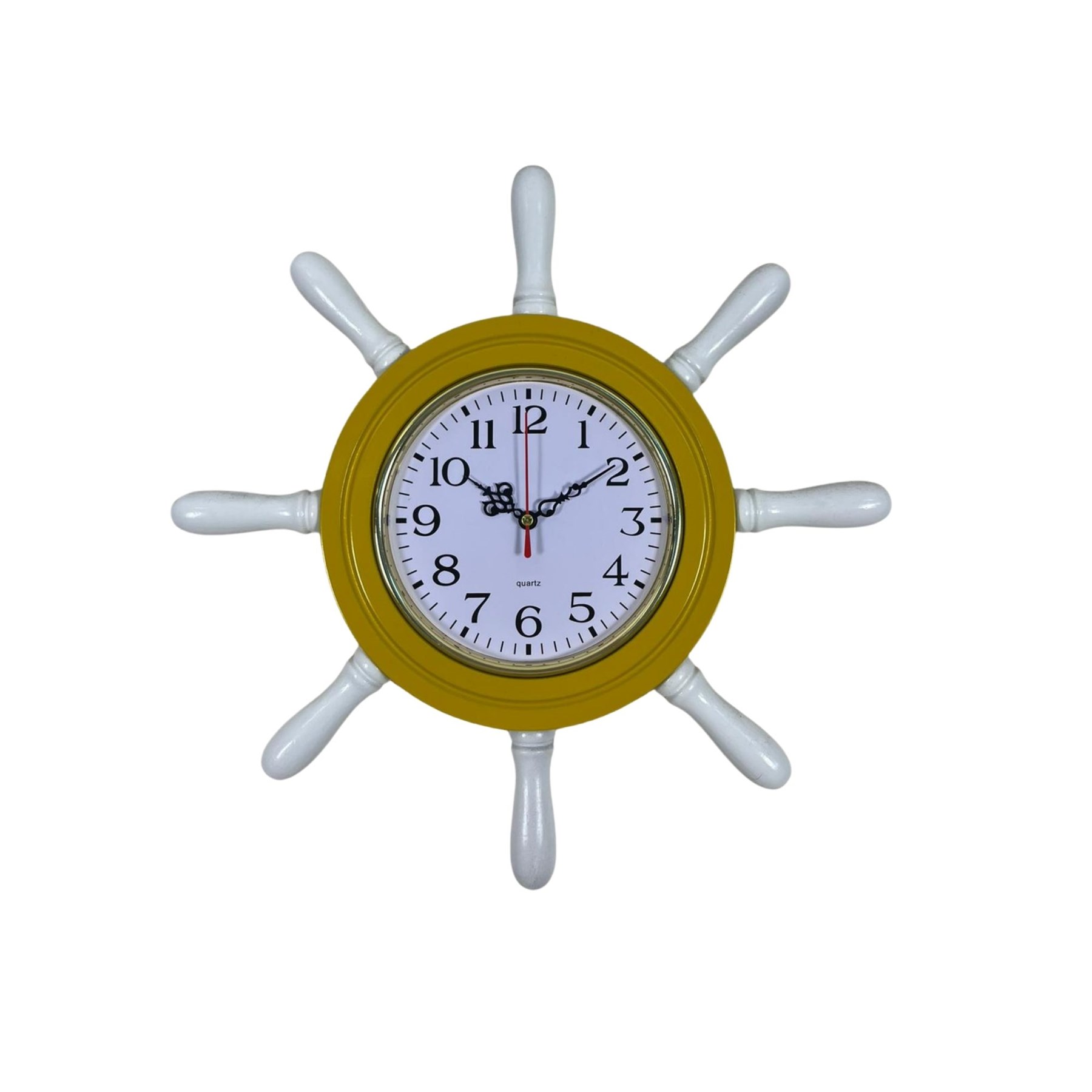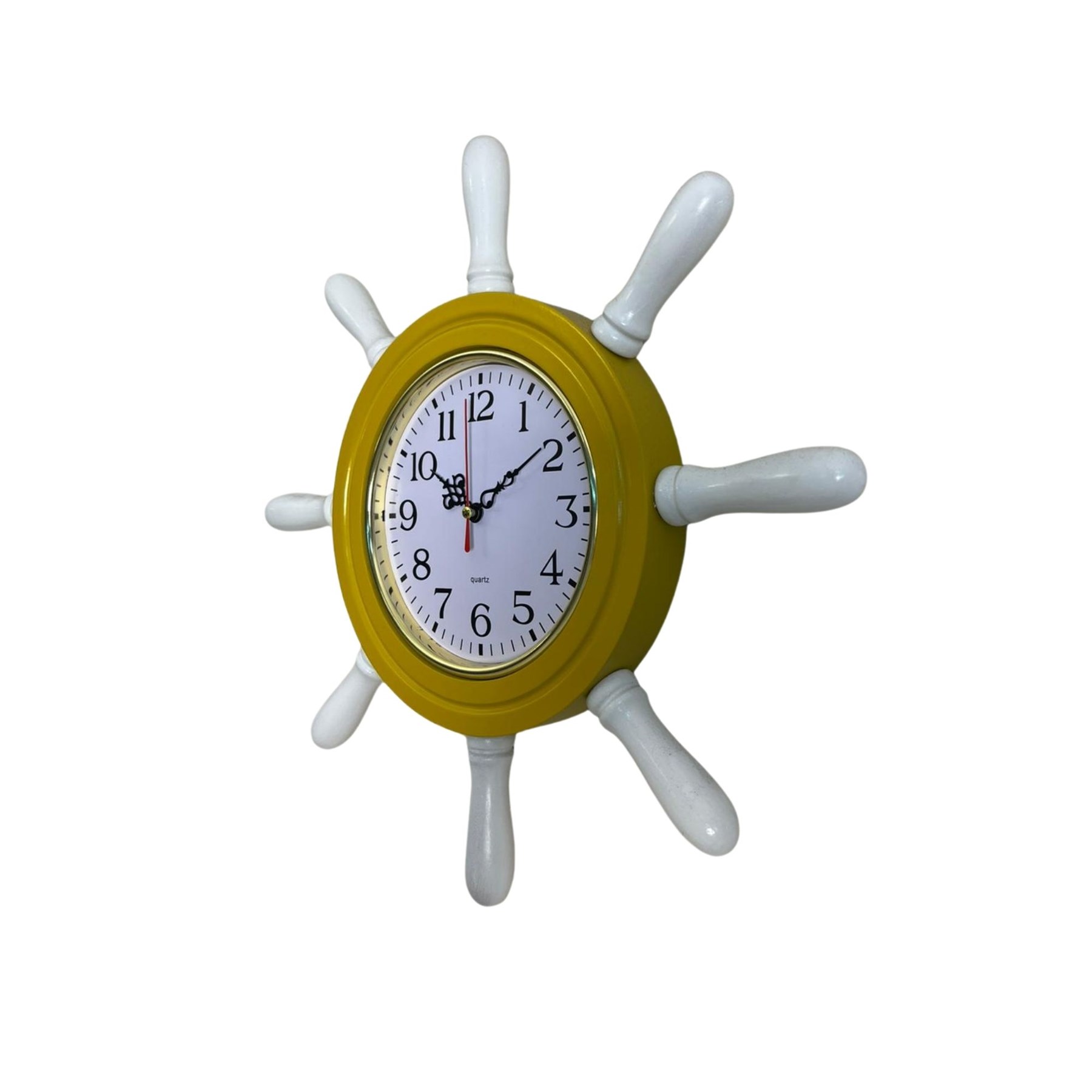 Sarı Kavelalı Dümen Duvar Saati, denizcilik temalı tasarımıyla yaşam alanlarına farklı ve dikkat çekici bir dekoratif dokunuş kazandıran özel bir duvar saatidir. Gemi dümeni formundan ilham alınarak tasarlanan bu model, sarı gövdesi ve beyaz kavelaları ile marin tarz dekorasyonu sevenler için estetik ve şık bir görünüm sunar.