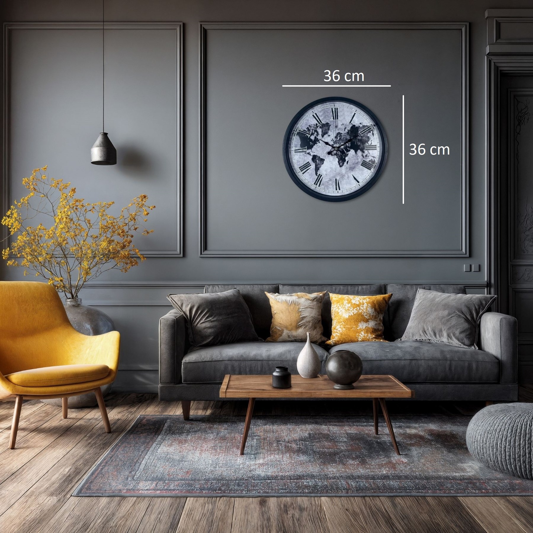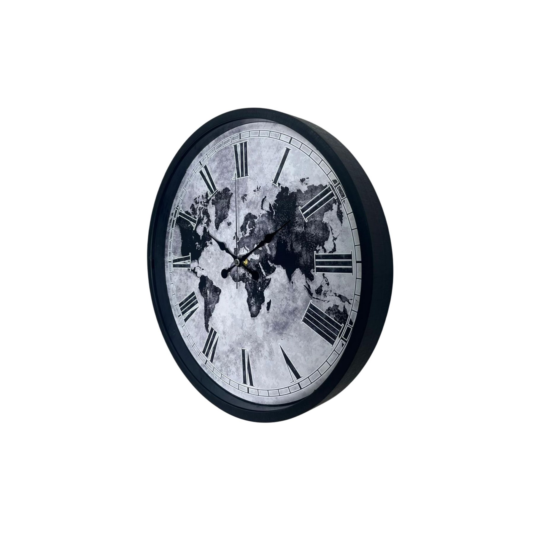 Siyah çerçevesi ve modern dünya haritası baskılı özel kadranı ile tasarlanan bu 36 cm duvar saati, güçlü ve karakterli bir dekorasyon tamamlayıcısıdır. Gri tonlu harita zemini ve Roma rakamlı tasarımı sayesinde hem modern hem endüstriyel dekorasyon stilleriyle mükemmel uyum sağlar.