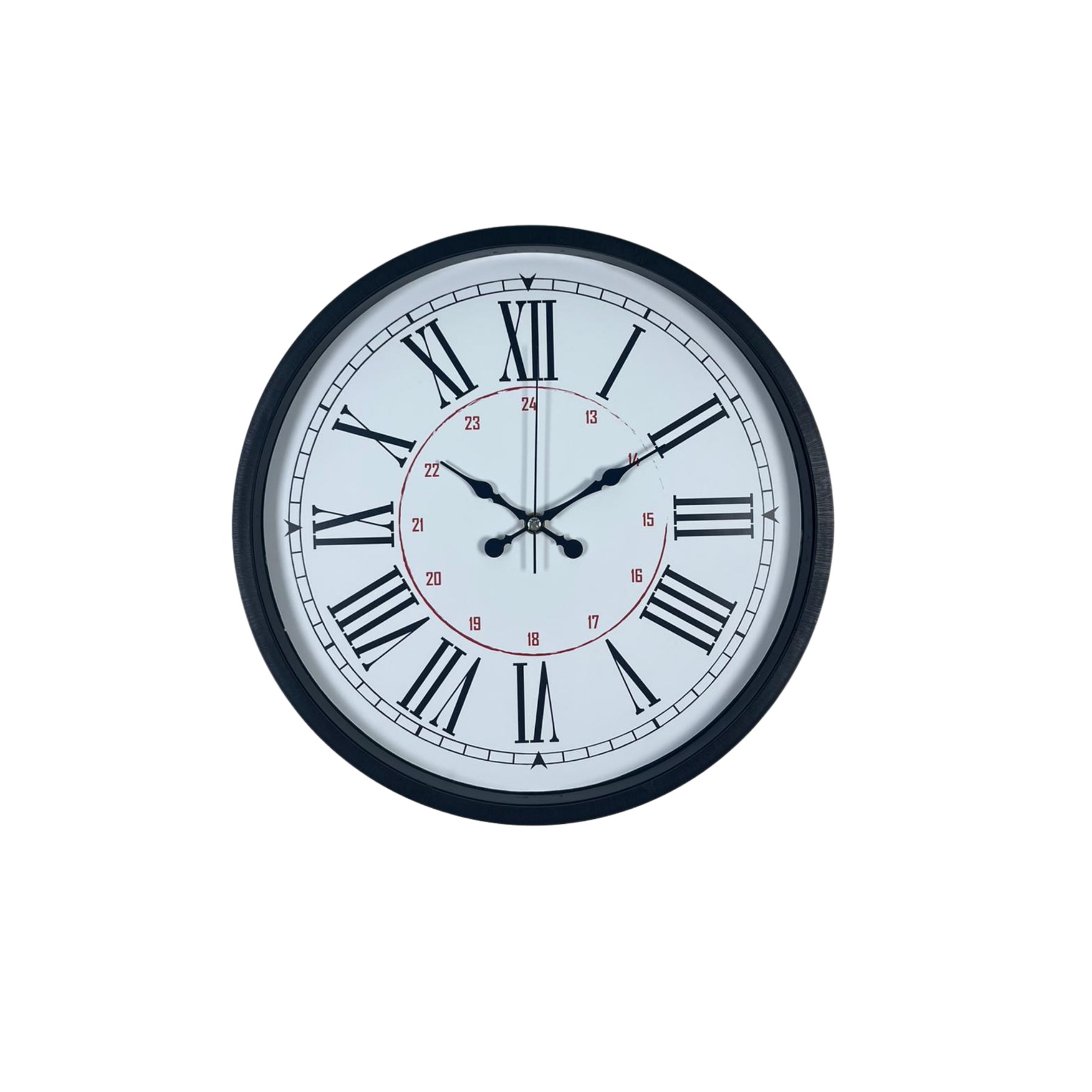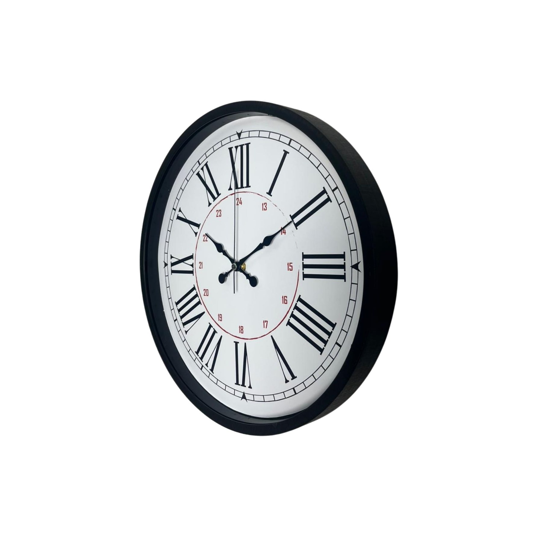 Siyah kasası ve beyaz kadranı ile tasarlanan bu 36 cm duvar saati, klasik Romen rakam detaylarıyla zamansız bir şıklık sunar. İç kısmında yer alan kırmızı 24 saat göstergesi sayesinde diğer standart saatlerden ayrılır ve daha fonksiyonel bir kullanım sağlar.