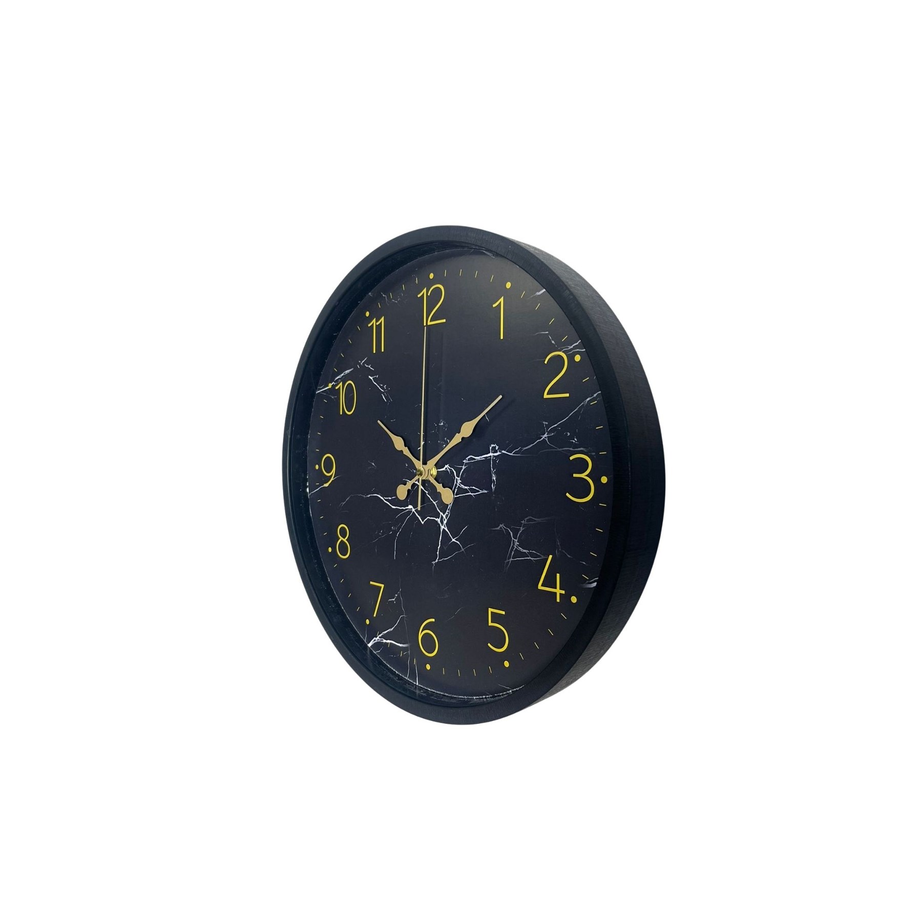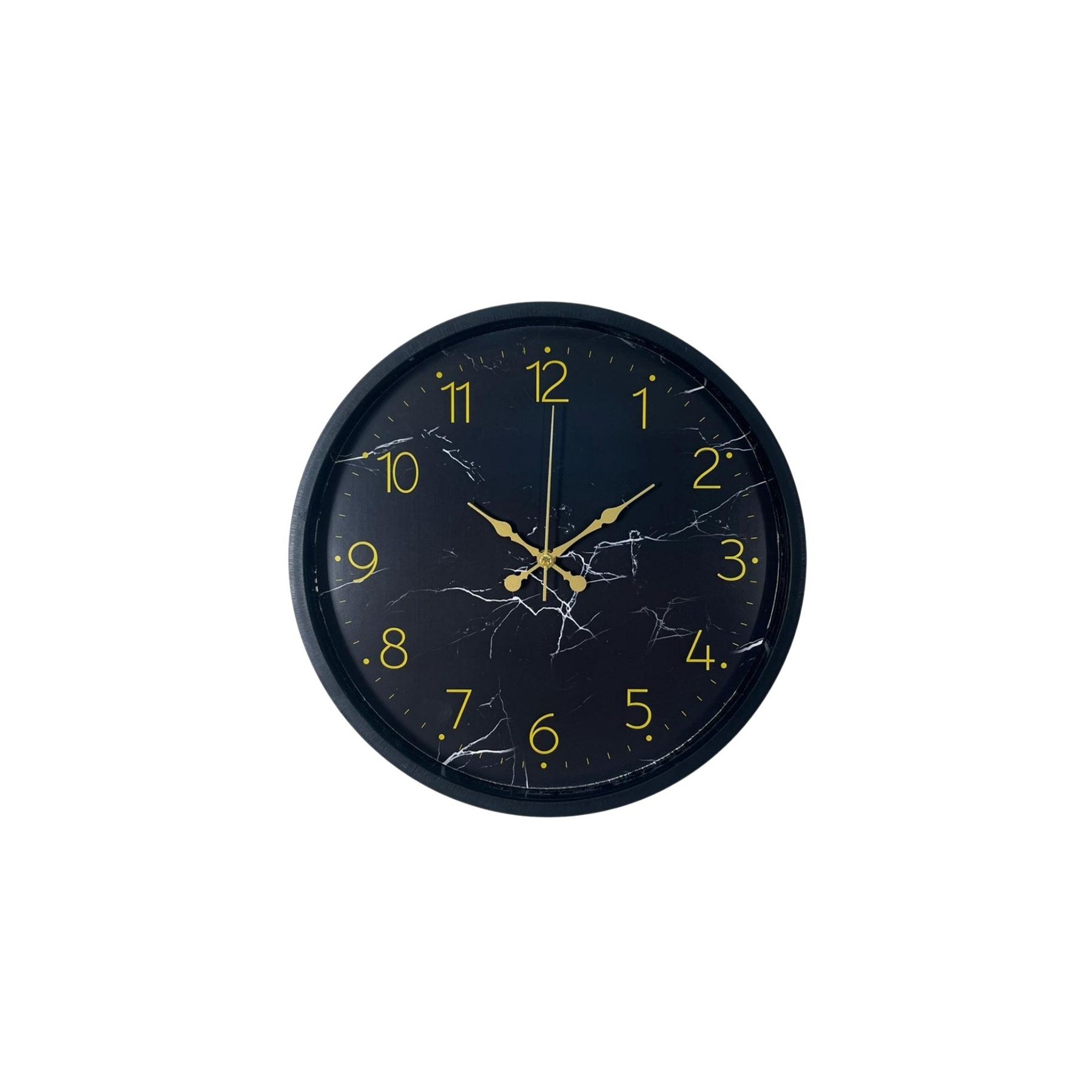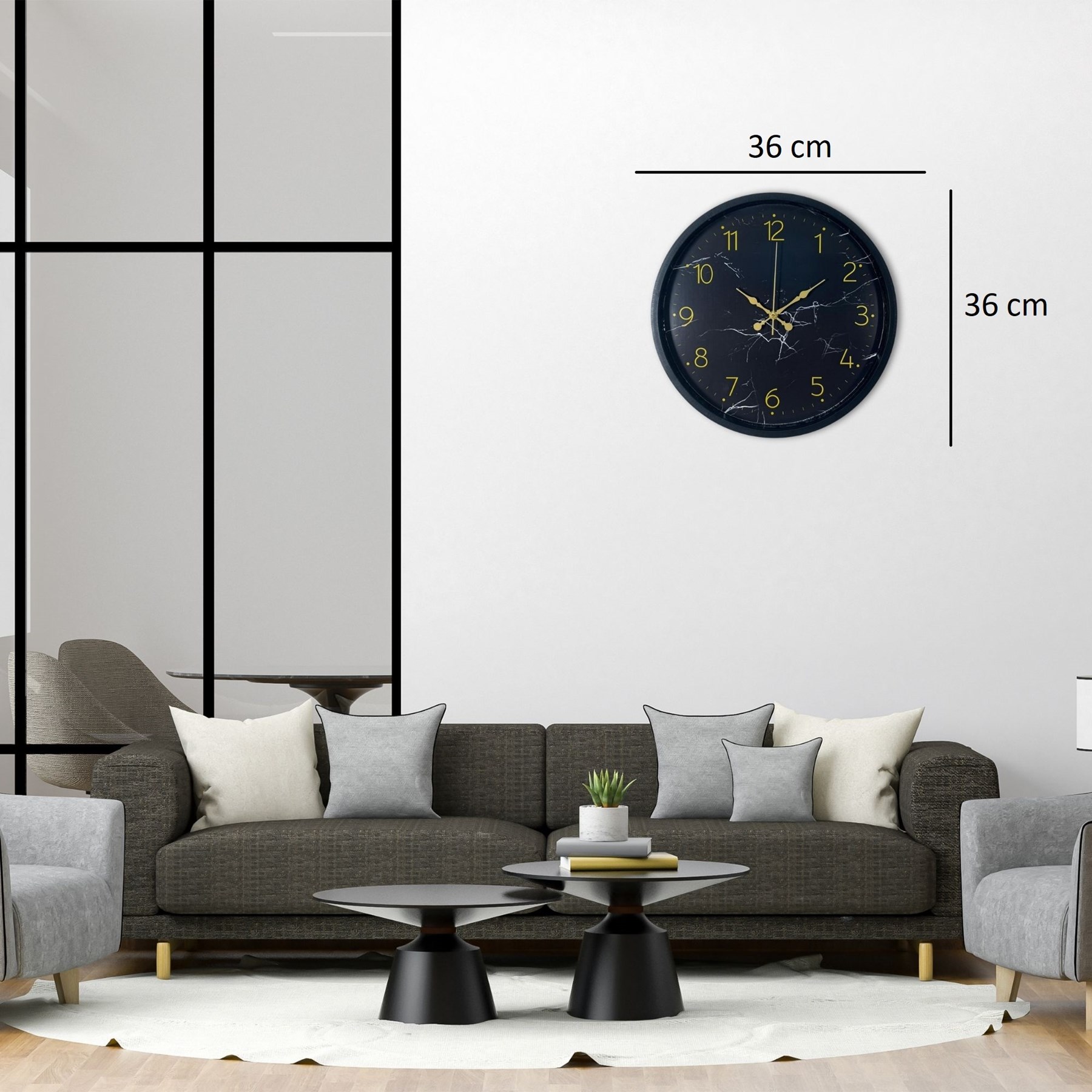 Şık siyah zemin üzerine mermer desen detayları ve gold rakam tasarımıyla öne çıkan bu 36 cm duvar saati, yaşam alanlarınıza modern ve sofistike bir hava katar. Gold renkli rakam ve akrep-yelkovan detayları sayesinde hem dekoratif hem de dikkat çekici bir görünüm sunar.
