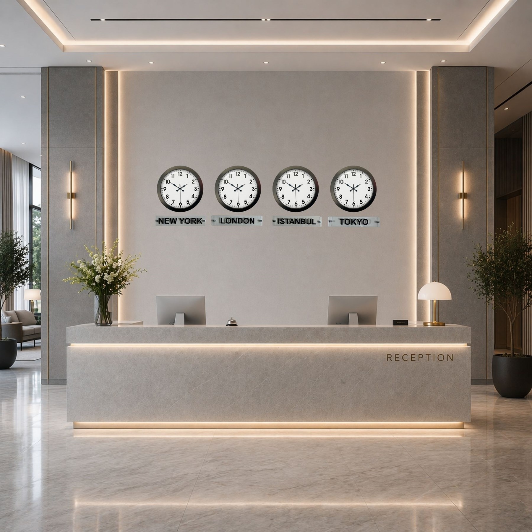 Modern ve şık tasarımıyla öne çıkan 36 cm 4’lü metal siyah dünya saatleri, farklı şehirlerin saat dilimlerini aynı anda takip etmek isteyenler için hem dekoratif hem de fonksiyonel bir çözümdür. Ofisler, oteller, resepsiyon alanları ve çalışma ortamları için profesyonel bir görünüm sunar.