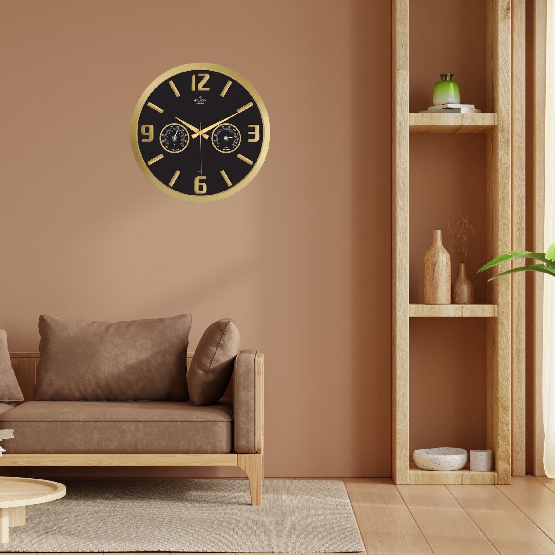 Gold Termometre ve Nem Ölçer Kabartma Rakamlı Duvar Saati