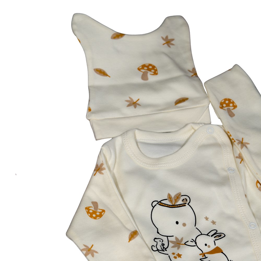 Minik ayı, tavşan ve kirpi baskılı bu tatlı 3 parçalı bebek takımı; mantar ve yaprak desenli alt parça, desenle uyumlu şapka ve çıtçıtlı uzun kollu üstten oluşur. Şık tasarımı kadar %100 pamuklu kumaşıyla da öne çıkan bu takım, bebeğinizin cildini sarar ve nefes aldırır. İlk aylarda ihtiyaç duyulan konforu ve sevimliliği bir arada sunar. Hem hediye hem hastane çıkışı olarak harika bir tercihtir.