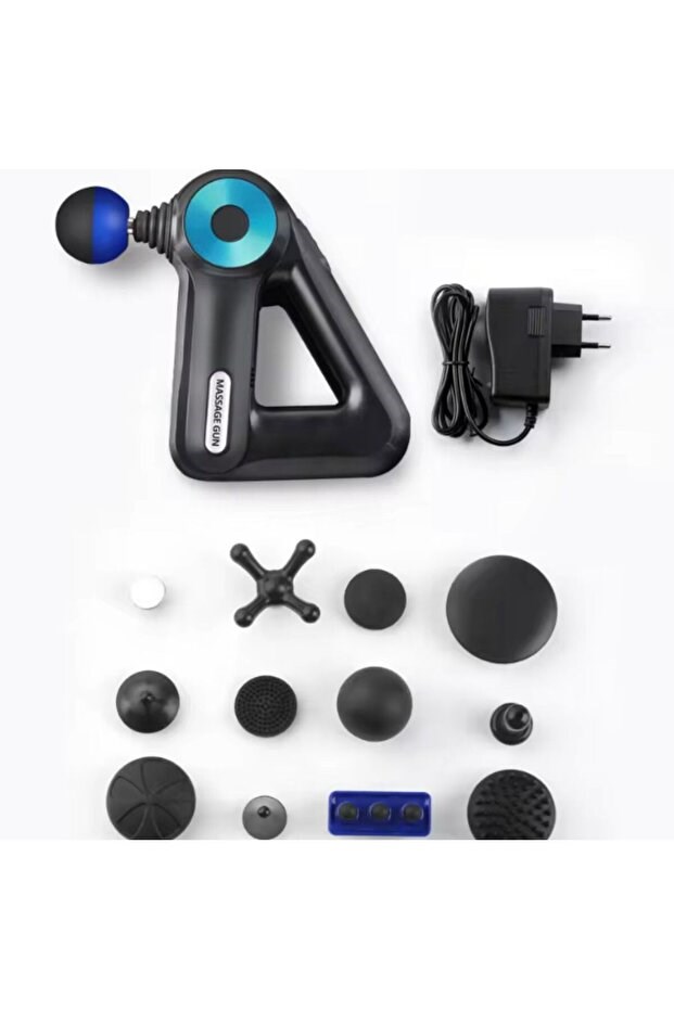 * Değiştirilebilir Masaj Başlıkları: Ürünün yanında farklı şekil ve boyutlarda masaj başlıkları bulunmaktadır. Bu başlıklar, farklı kas gruplarına (geniş kaslar, eklemler, hassas bölgeler vb.) ve masaj yoğunluklarına göre özelleştirilmiş bir masaj deneyimi sağlar. Resimde görülen başlıklar arasında yuvarlak, düz, çatal ve mermi şekilli başlıklar bulunmaktadır, bu da ürünün çok çeşitli masaj ihtiyaçlarını karşılayabileceğini gösterir.