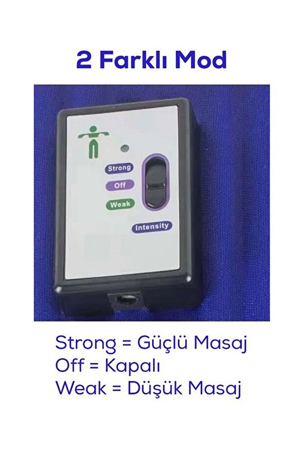 Masaj modları "Strong" (Güçlü), "Weak" (Zayıf) ve "Off" (Kapalı) seçenekleriyle kolayca kontrol edilir.