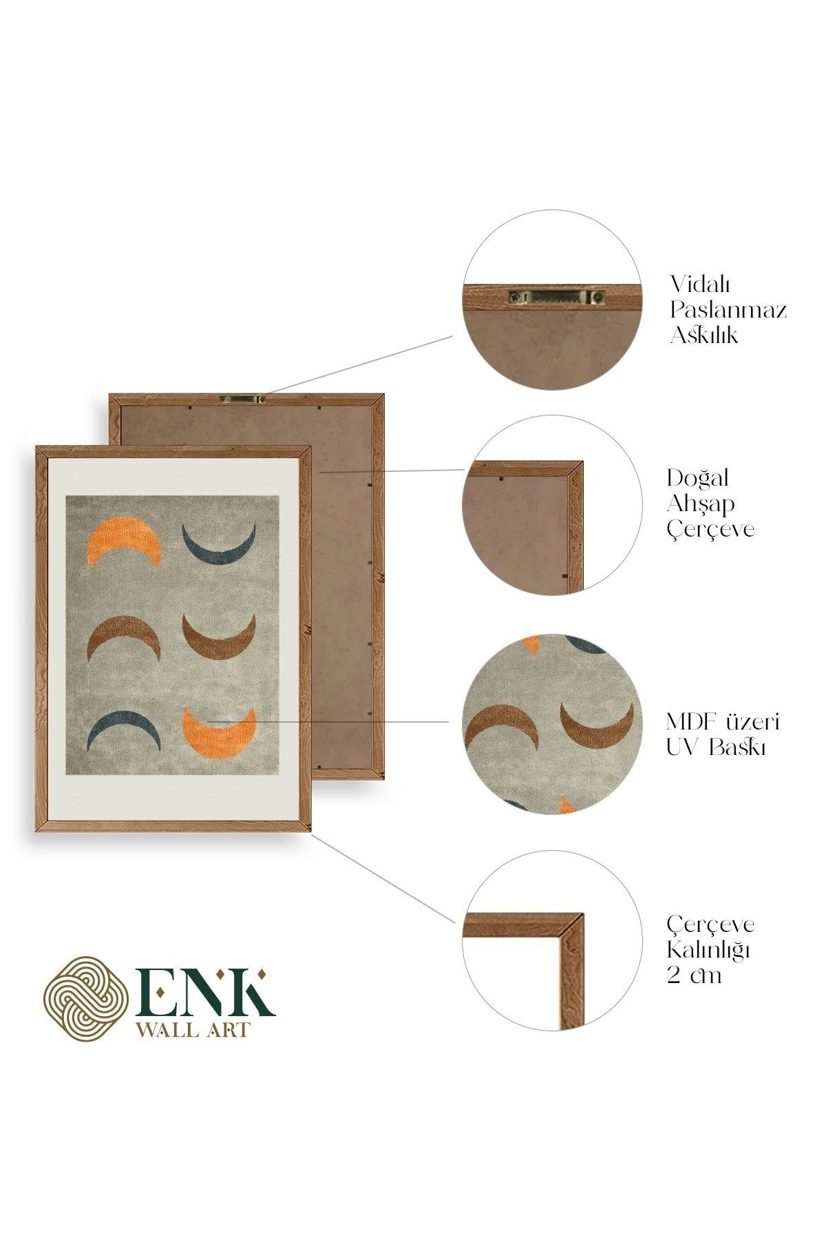 Tablolarımız gerçek ahşap çerçevelidir, çerçeve görünümlü değildir. ; ENK Wall Art Olarak Ahşap Çerçeveli Tablolar Üretiyoruz. ; Tablolarımız tek parça, 3 Parça, 5 Parça ve daha çok kategoride tasarımcılarımız tarafından ev ve ofisleriniz duvarları süslemek için tasarlanmaktadır. ; Ahşap Çerçeveli Duvar Tabloları ile yaşam alanlarınıza yepyeni bir görünüm kazandırın. ; Yıllarca dayanacağından emin olduğumuz sağlam çerçevelere sahip yüksek kaliteli ahşaptan üretilmiştir. ; İster bir köşeyi süslemek isteyin, ister evinizi yenilemek , bu ahşap tablolar herhangi bir yaşam alanına stil ve işlev getirecektir. ; Duvara kolay bir şekilde monte edilir. ; Uzun ömürlü kullanım için sağlam ahşap çerçeveden yapılmış, dayanıklı ve güçlü. ; Duvara monte edilebilir tasarımı, yaşam alanlarında veya yatak odalarında duvara kolayca asılmasını sağlar. ; Pürüzsüz üst yüzeyi temiz kalmayı kolaylaştırır. ; Herhangi bir stile uyacak şekilde çeşitli renklerde gelir. ; Kolay yeniden düzenleme için hafif ve portatif. ; Küçük oturma odaları veya dar alanlar için mükemmel boyut. ; Eve taşınma hediyesi olarak idealdir. ; Herhangi bir evin dekorunu süslemek için harika bir yol. ; Herhangi bir modern veya çağdaş iç tasarıma mükemmel bir katkı. ; Tablo içi 3 mm mdf (ahşap) malzeme üzeri uv baskıdır. ; Renkler canlı ve solma yapmaz. ; Kırılma, bükülme ve çizilmeye karşı dayanıklıdır.;