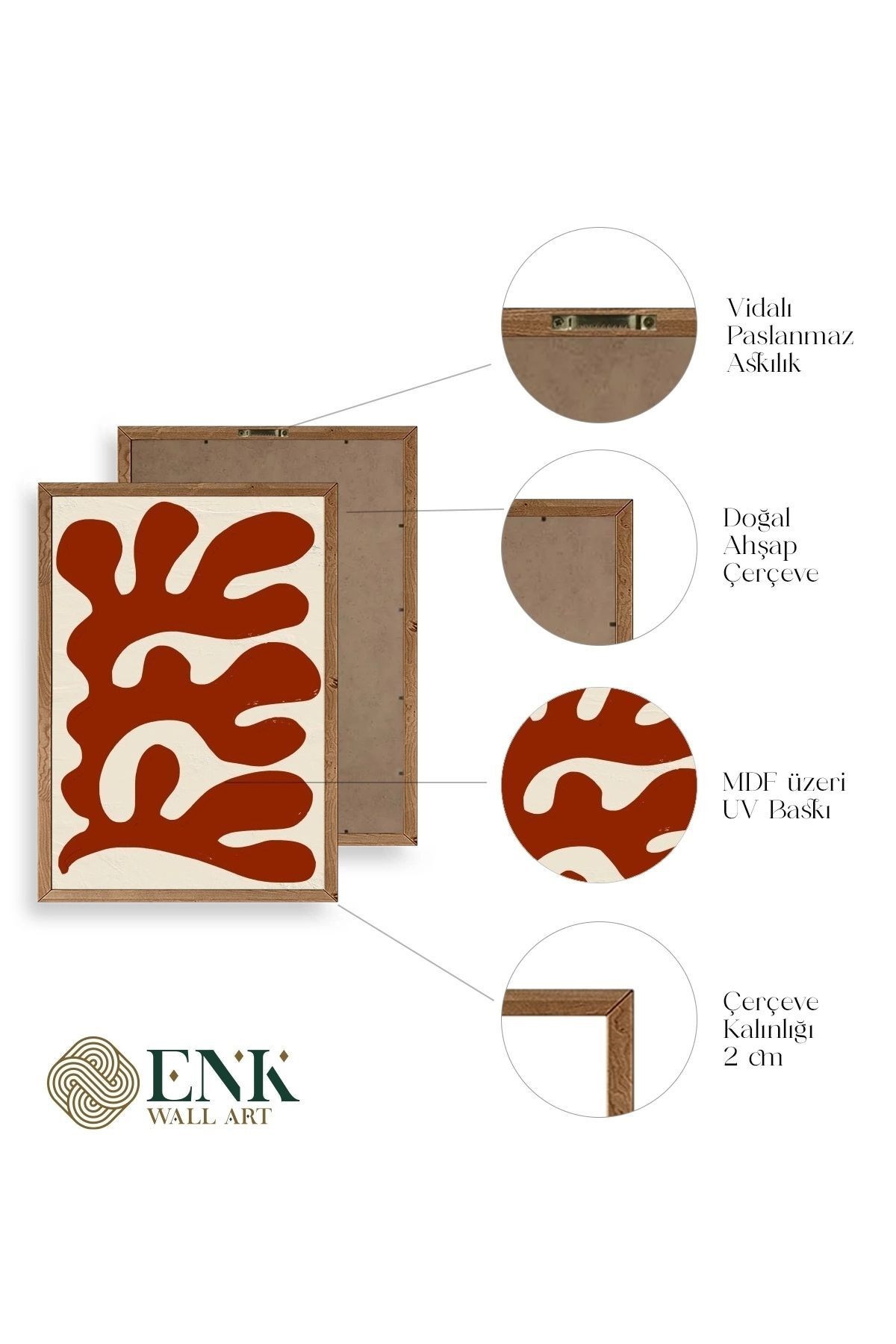 Tablolarımız gerçek ahşap çerçevelidir, çerçeve görünümlü değildir. ; ENK Wall Art Olarak Ahşap Çerçeveli Tablolar Üretiyoruz. ; Tablolarımız tek parça, 3 Parça, 5 Parça ve daha çok kategoride tasarımcılarımız tarafından ev ve ofisleriniz duvarları süslemek için tasarlanmaktadır. ; Ahşap Çerçeveli Duvar Tabloları ile yaşam alanlarınıza yepyeni bir görünüm kazandırın. ; Yıllarca dayanacağından emin olduğumuz sağlam çerçevelere sahip yüksek kaliteli ahşaptan üretilmiştir. ; İster bir köşeyi süslemek isteyin, ister evinizi yenilemek , bu ahşap tablolar herhangi bir yaşam alanına stil ve işlev getirecektir. ; Duvara kolay bir şekilde monte edilir. ; Uzun ömürlü kullanım için sağlam ahşap çerçeveden yapılmış, dayanıklı ve güçlü. ; Duvara monte edilebilir tasarımı, yaşam alanlarında veya yatak odalarında duvara kolayca asılmasını sağlar. ; Pürüzsüz üst yüzeyi temiz kalmayı kolaylaştırır. ; Herhangi bir stile uyacak şekilde çeşitli renklerde gelir. ; Kolay yeniden düzenleme için hafif ve portatif. ; Küçük oturma odaları veya dar alanlar için mükemmel boyut. ; Eve taşınma hediyesi olarak idealdir. ; Herhangi bir evin dekorunu süslemek için harika bir yol. ; Herhangi bir modern veya çağdaş iç tasarıma mükemmel bir katkı. ; Tablo içi 3 mm mdf (ahşap) malzeme üzeri uv baskıdır. ; Renkler canlı ve solma yapmaz. ; Kırılma, bükülme ve çizilmeye karşı dayanıklıdır.;
