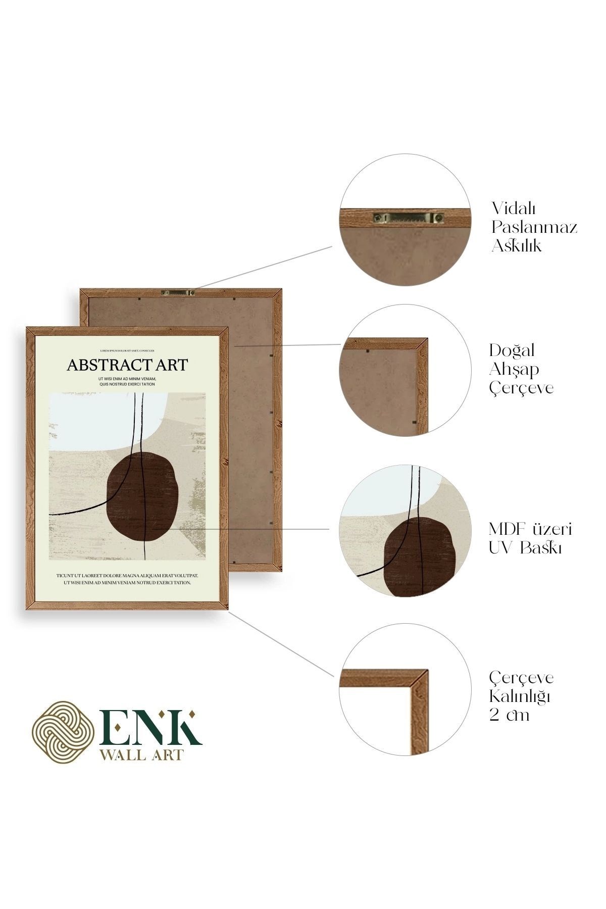 Tablolarımız gerçek ahşap çerçevelidir, çerçeve görünümlü değildir. ; Kahverengi ve Natural Çerçeveler Masif Ahşap Çerçevedir. ; Siyah ve Beyaz Çerçeveler Ahşap Değildir. ; ENK Wall Art Olarak Ahşap Çerçeveli Tablolar Üretiyoruz. ; Tablolarımız tek parça, 3 Parça, 5 Parça ve daha çok kategoride tasarımcılarımız tarafından ev ve ofisleriniz duvarları süslemek için tasarlanmaktadır. ; Ahşap Çerçeveli Duvar Tabloları ile yaşam alanlarınıza yepyeni bir görünüm kazandırın. ; Yıllarca dayanacağından emin olduğumuz sağlam çerçevelere sahip yüksek kaliteli ahşaptan üretilmiştir. ; İster bir köşeyi süslemek isteyin, ister evinizi yenilemek , bu ahşap tablolar herhangi bir yaşam alanına stil ve işlev getirecektir. ; Duvara kolay bir şekilde monte edilir. ; Uzun ömürlü kullanım için sağlam ahşap çerçeveden yapılmış, dayanıklı ve güçlü. ; Duvara monte edilebilir tasarımı, yaşam alanlarında veya yatak odalarında duvara kolayca asılmasını sağlar. ; Pürüzsüz üst yüzeyi temiz kalmayı kolaylaştırır. ; Herhangi bir stile uyacak şekilde çeşitli renklerde gelir. ; Kolay yeniden düzenleme için hafif ve portatif. ; Küçük oturma odaları veya dar alanlar için mükemmel boyut. ; Eve taşınma hediyesi olarak idealdir. ; Herhangi bir evin dekorunu süslemek için harika bir yol. ; Herhangi bir modern veya çağdaş iç tasarıma mükemmel bir katkı. ; Tablo içi 3 mm mdf (ahşap) malzeme üzeri uv baskıdır. ; Renkler canlı ve solma yapmaz. ; Kırılma, bükülme ve çizilmeye karşı dayanıklıdır.;