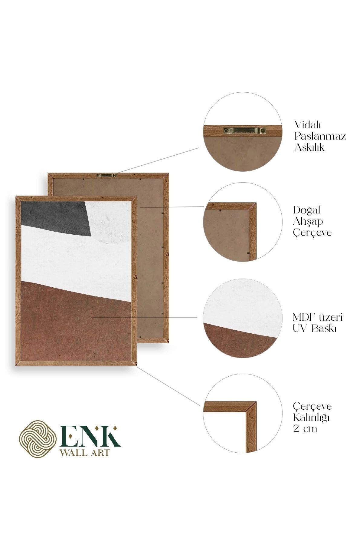 Tablolarımız gerçek ahşap çerçevelidir, çerçeve görünümlü değildir. ; Kahverengi ve Natural Çerçeveler Masif Ahşap Çerçevedir. ; Siyah ve Beyaz Çerçeveler Ahşap Değildir. ; ENK Wall Art Olarak Ahşap Çerçeveli Tablolar Üretiyoruz. ; Tablolarımız tek parça, 3 Parça, 5 Parça ve daha çok kategoride tasarımcılarımız tarafından ev ve ofisleriniz duvarları süslemek için tasarlanmaktadır. ; Ahşap Çerçeveli Duvar Tabloları ile yaşam alanlarınıza yepyeni bir görünüm kazandırın. ; Yıllarca dayanacağından emin olduğumuz sağlam çerçevelere sahip yüksek kaliteli ahşaptan üretilmiştir. ; İster bir köşeyi süslemek isteyin, ister evinizi yenilemek , bu ahşap tablolar herhangi bir yaşam alanına stil ve işlev getirecektir. ; Duvara kolay bir şekilde monte edilir. ; Uzun ömürlü kullanım için sağlam ahşap çerçeveden yapılmış, dayanıklı ve güçlü. ; Duvara monte edilebilir tasarımı, yaşam alanlarında veya yatak odalarında duvara kolayca asılmasını sağlar. ; Pürüzsüz üst yüzeyi temiz kalmayı kolaylaştırır. ; Herhangi bir stile uyacak şekilde çeşitli renklerde gelir. ; Kolay yeniden düzenleme için hafif ve portatif. ; Küçük oturma odaları veya dar alanlar için mükemmel boyut. ; Eve taşınma hediyesi olarak idealdir. ; Herhangi bir evin dekorunu süslemek için harika bir yol. ; Herhangi bir modern veya çağdaş iç tasarıma mükemmel bir katkı. ; Tablo içi 3 mm mdf (ahşap) malzeme üzeri uv baskıdır. ; Renkler canlı ve solma yapmaz. ; Kırılma, bükülme ve çizilmeye karşı dayanıklıdır.;