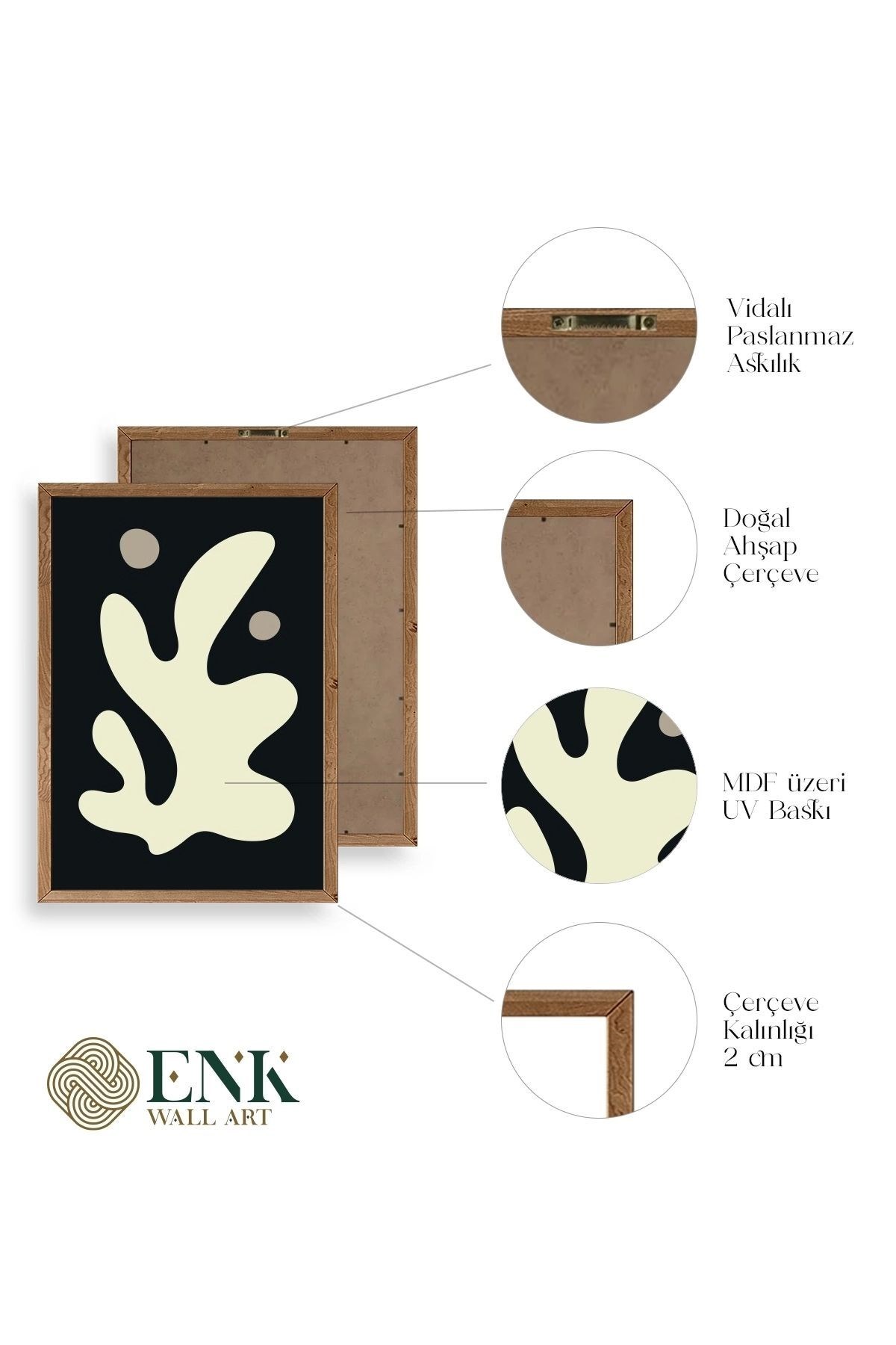 Tablolarımız gerçek ahşap çerçevelidir, çerçeve görünümlü değildir. ; Kahverengi ve Natural Çerçeveler Masif Ahşap Çerçevedir. ; Siyah ve Beyaz Çerçeveler Ahşap Değildir. ; ENK Wall Art Olarak Ahşap Çerçeveli Tablolar Üretiyoruz. ; Tablolarımız tek parça, 3 Parça, 5 Parça ve daha çok kategoride tasarımcılarımız tarafından ev ve ofisleriniz duvarları süslemek için tasarlanmaktadır. ; Ahşap Çerçeveli Duvar Tabloları ile yaşam alanlarınıza yepyeni bir görünüm kazandırın. ; Yıllarca dayanacağından emin olduğumuz sağlam çerçevelere sahip yüksek kaliteli ahşaptan üretilmiştir. ; İster bir köşeyi süslemek isteyin, ister evinizi yenilemek , bu ahşap tablolar herhangi bir yaşam alanına stil ve işlev getirecektir. ; Duvara kolay bir şekilde monte edilir. ; Uzun ömürlü kullanım için sağlam ahşap çerçeveden yapılmış, dayanıklı ve güçlü. ; Duvara monte edilebilir tasarımı, yaşam alanlarında veya yatak odalarında duvara kolayca asılmasını sağlar. ; Pürüzsüz üst yüzeyi temiz kalmayı kolaylaştırır. ; Herhangi bir stile uyacak şekilde çeşitli renklerde gelir. ; Kolay yeniden düzenleme için hafif ve portatif. ; Küçük oturma odaları veya dar alanlar için mükemmel boyut. ; Eve taşınma hediyesi olarak idealdir. ; Herhangi bir evin dekorunu süslemek için harika bir yol. ; Herhangi bir modern veya çağdaş iç tasarıma mükemmel bir katkı. ; Tablo içi 3 mm mdf (ahşap) malzeme üzeri uv baskıdır. ; Renkler canlı ve solma yapmaz. ; Kırılma, bükülme ve çizilmeye karşı dayanıklıdır.;