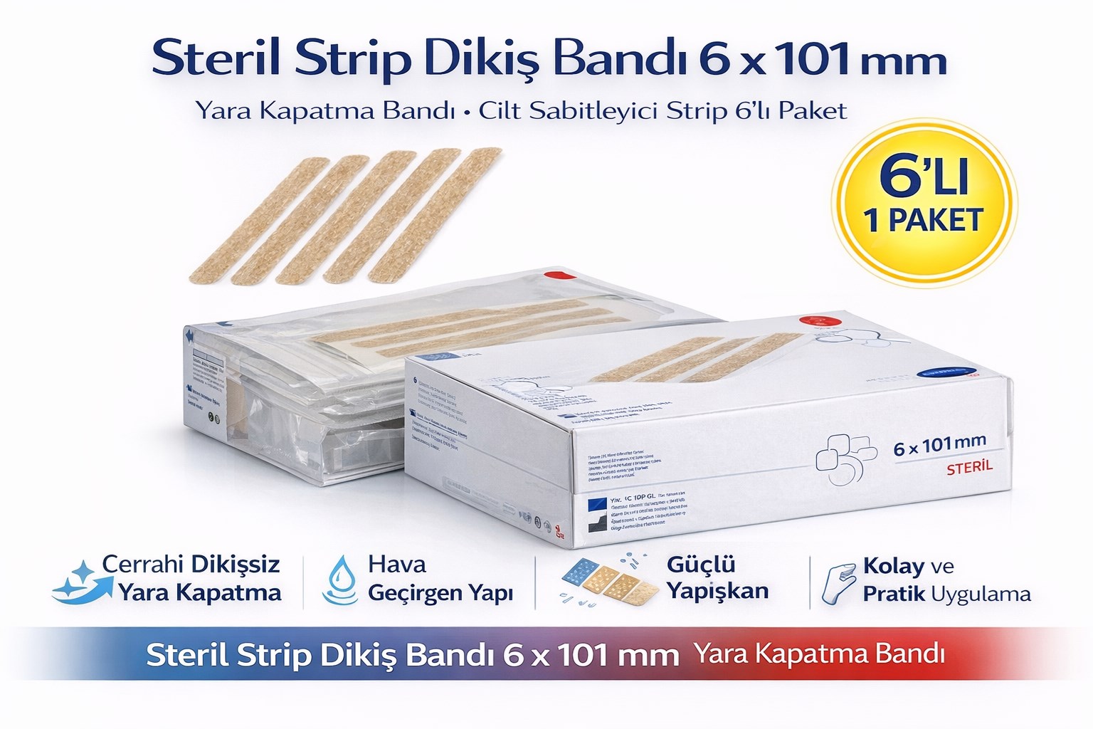 Steril Strip Dikiş Bandı 6 x 101 mm Yara Kapatma Bandı Cilt Sabitleyici Strip 6’lı 1 Paket