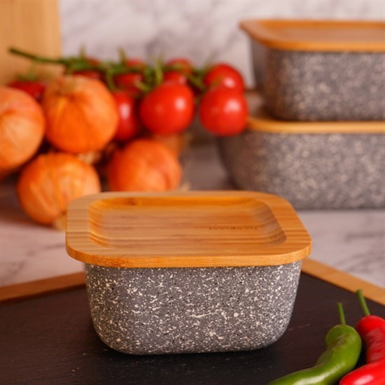 Slalom Kare - Bambu Kapaklı Granit Saklama Kabı 15Cm Platin Gri-24483