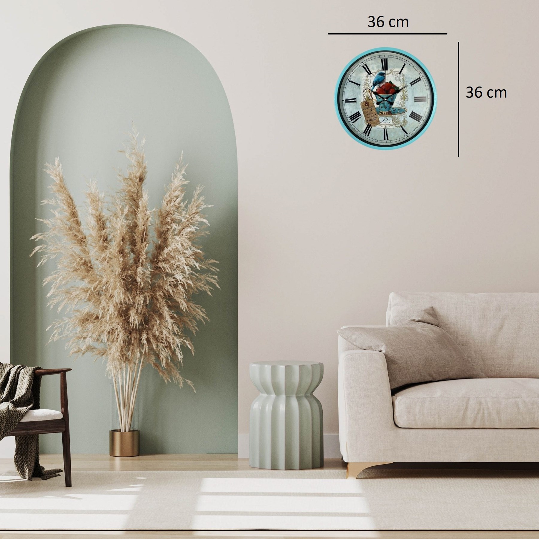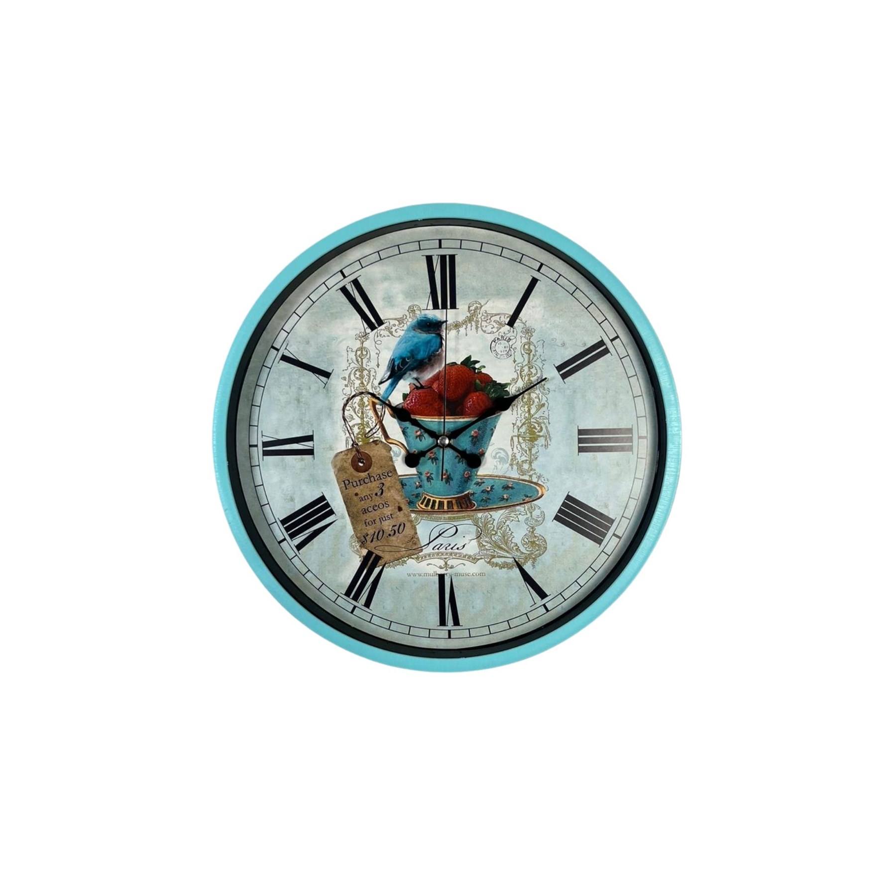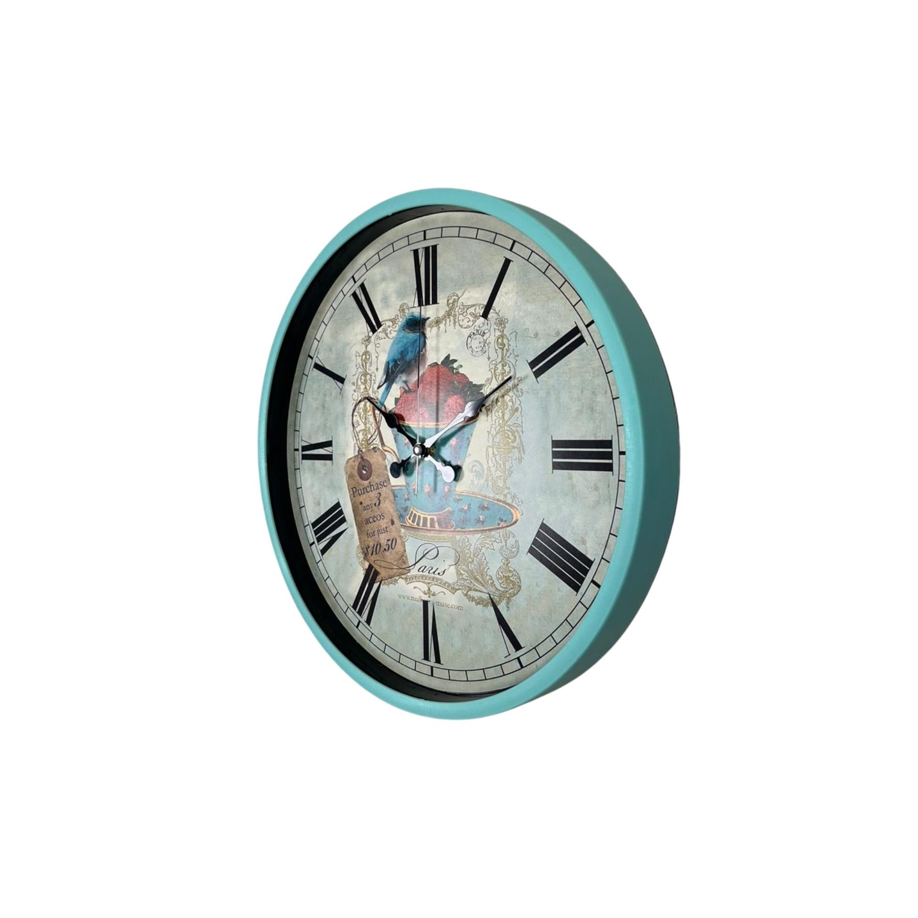Zarif ve nostaljik tasarımıyla öne çıkan 36 cm turkuaz duvar saati, kuş ve çilek temalı vintage kadran tasarımı ile yaşam alanlarınıza şık ve dekoratif bir atmosfer kazandırır. Paris esintili detaylara sahip özel tasarımı sayesinde salon, mutfak, oturma odası, kafe ve restoran dekorasyonlarında dikkat çekici bir tamamlayıcıdır.