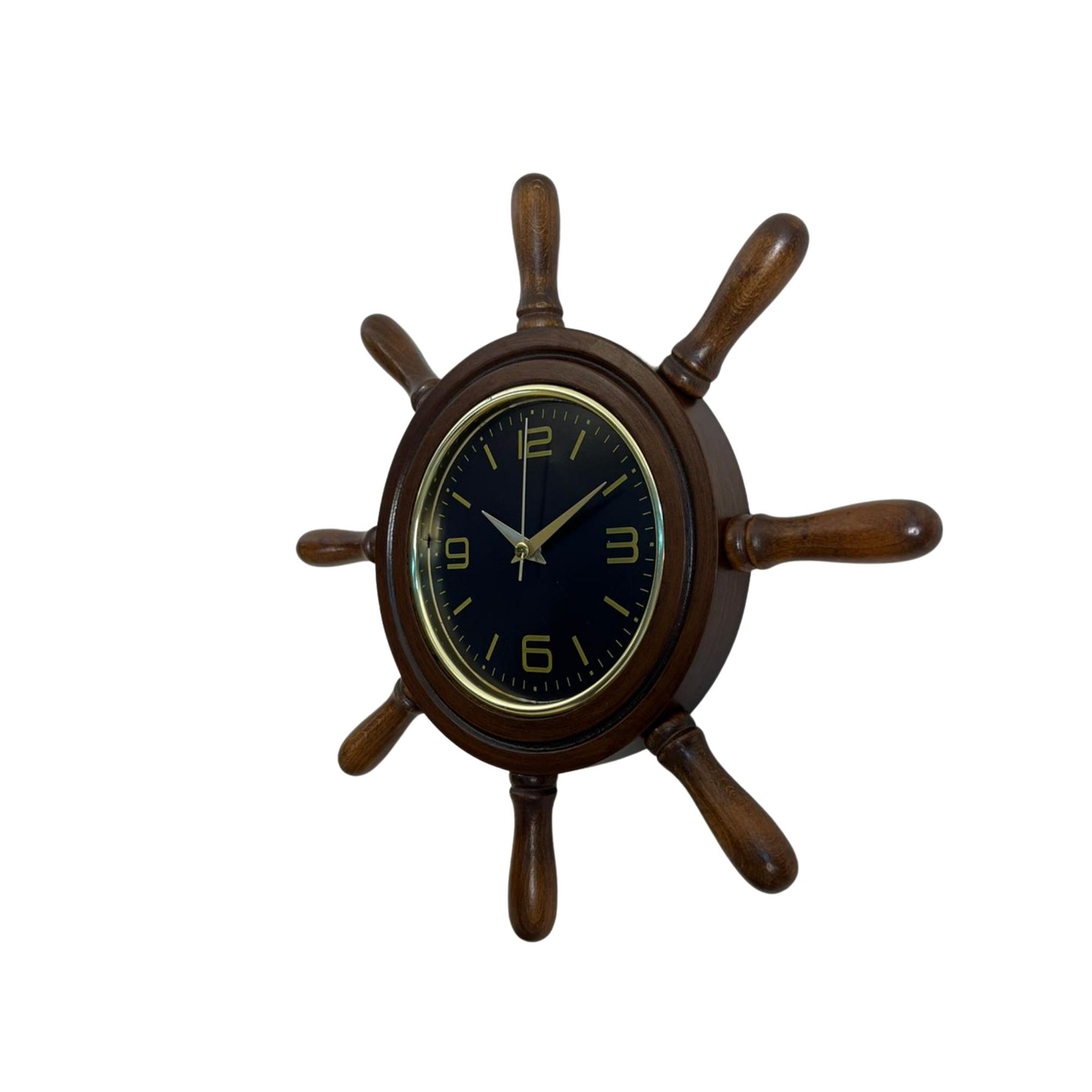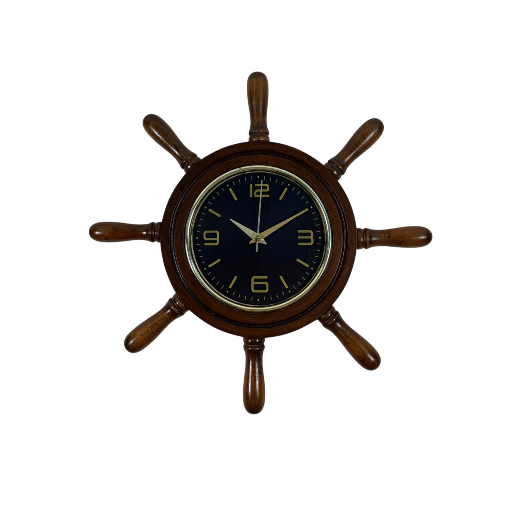 Saatin etrafında bulunan dümen kolları (kavelalar), gerçek bir gemi dümenini andıran detaylı bir tasarıma sahiptir. Bu kavelalar 8 cm uzunluğunda olup saatin marin karakterini güçlendiren estetik bir görünüm sunar. Saat kısmının çapı ise 37 cm olup duvar üzerinde dengeli ve dikkat çekici bir ölçü sunar.
