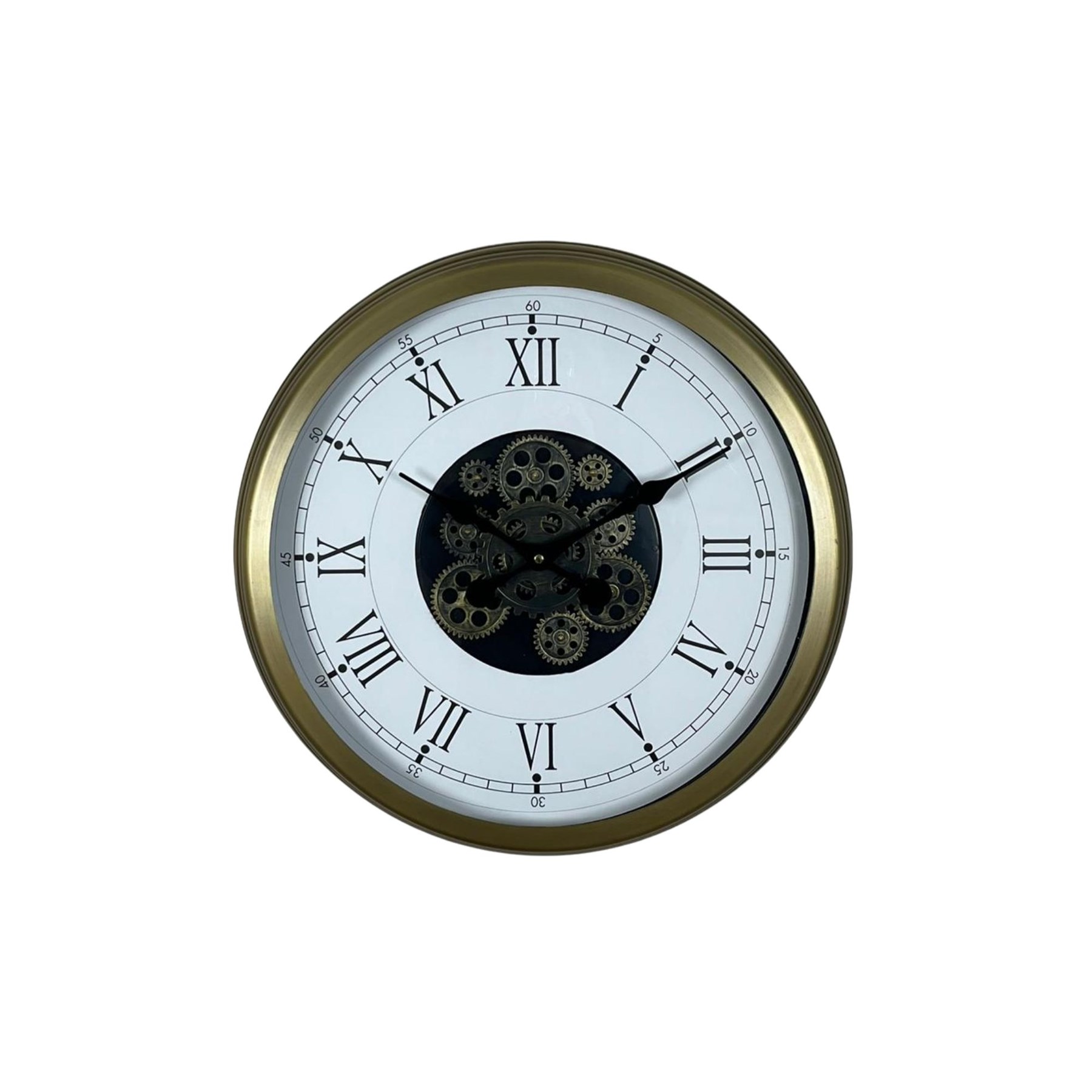 Beyaz kadranı, zarif Roma rakamları ve merkezde yer alan hareketli çark detayıyla tasarlanan bu 60 cm duvar saati; klasik çizgiyi modern dokunuşla birleştirir. Gold tonlu metal çerçevesi ürüne şık ve premium bir görünüm kazandırırken, sade tasarımı sayesinde her dekorasyon stiline kolayca uyum sağlar.
