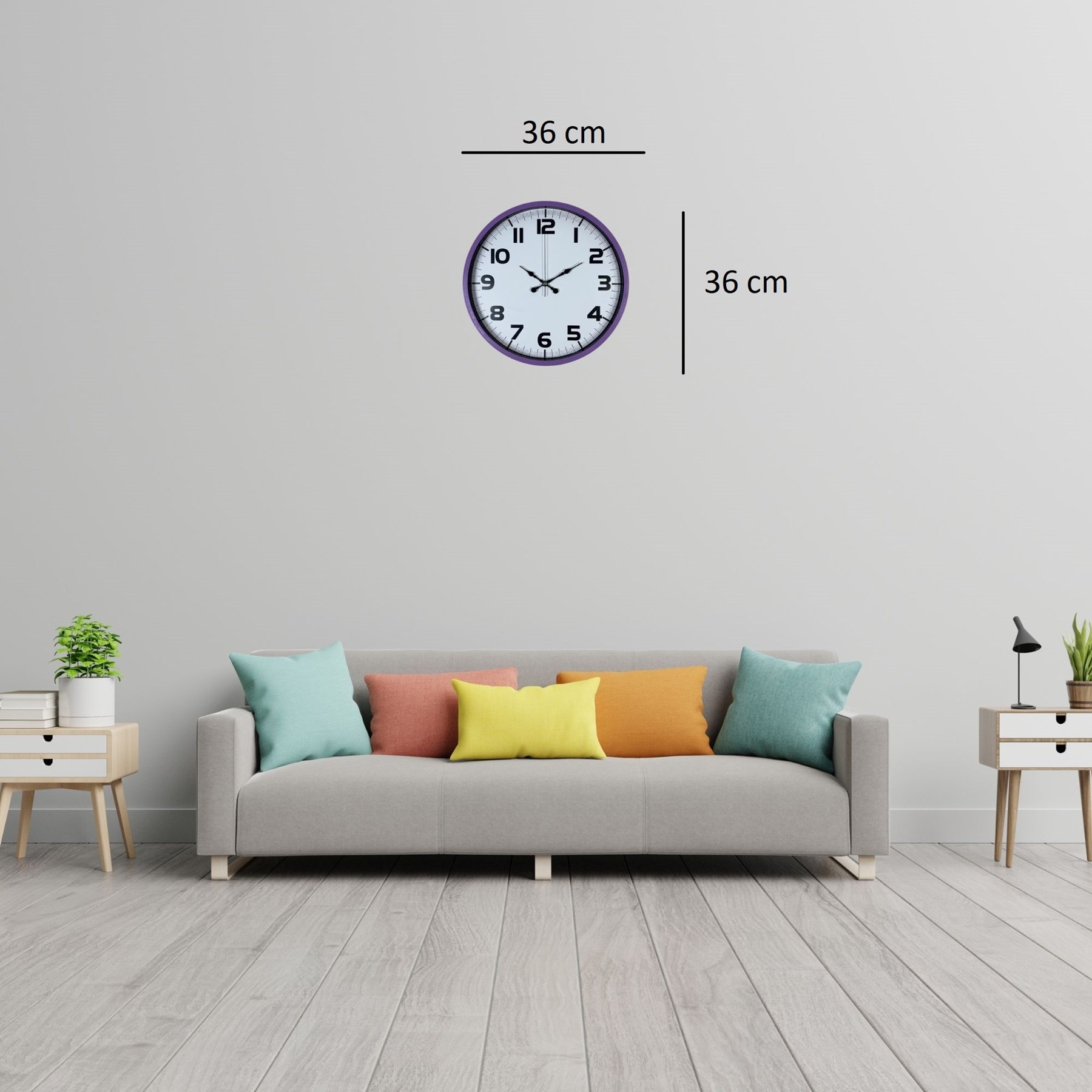 Modern tasarımı ve dikkat çekici mor rengiyle öne çıkan 36 cm duvar saati, yaşam alanlarınıza şıklık ve renk katar. Minimalist kadranı ve büyük, okunaklı rakamları sayesinde zamanı rahatlıkla takip edebilirsiniz. Salon, mutfak, ofis ve genç odalarında dekoratif bir tamamlayıcı olarak kullanılabilir.