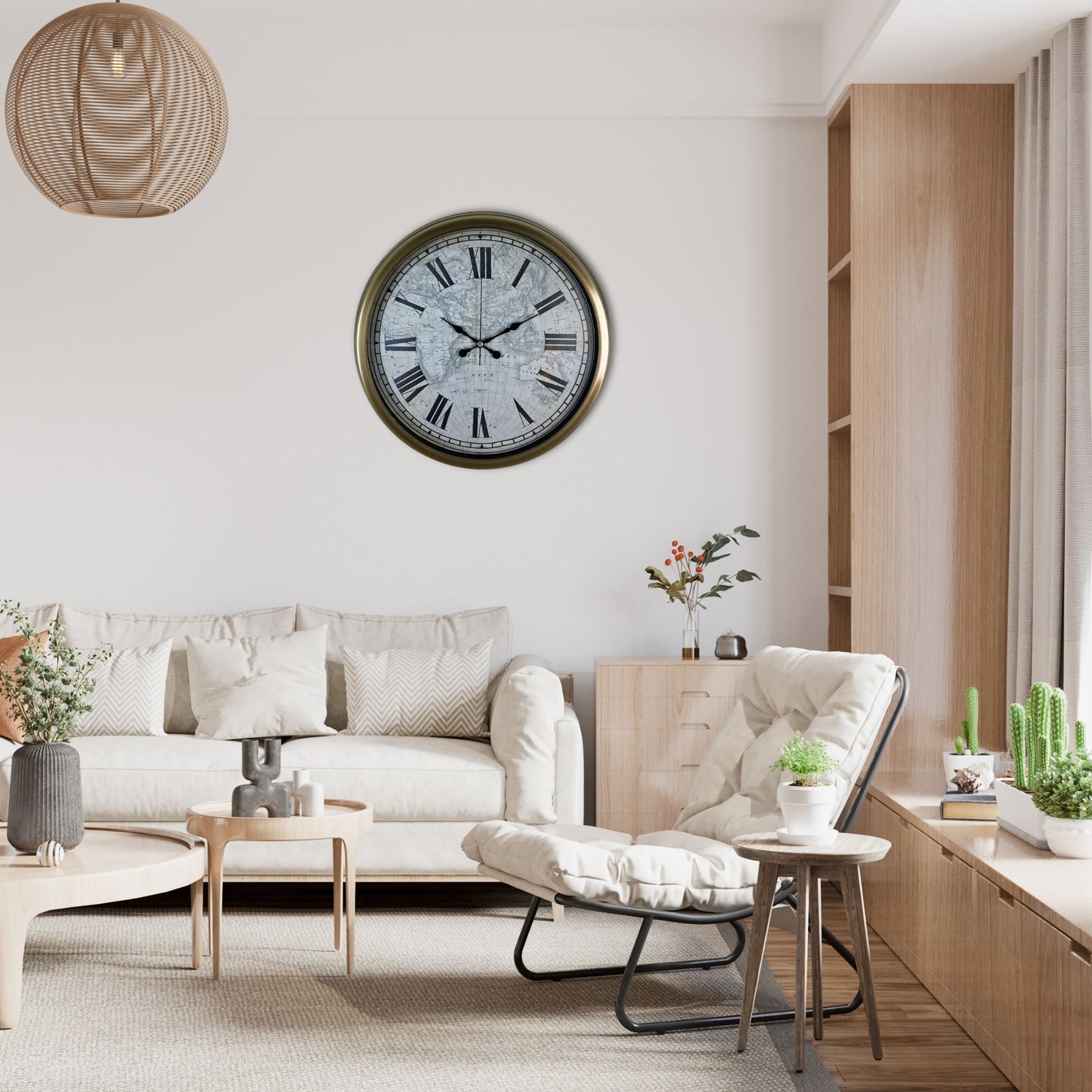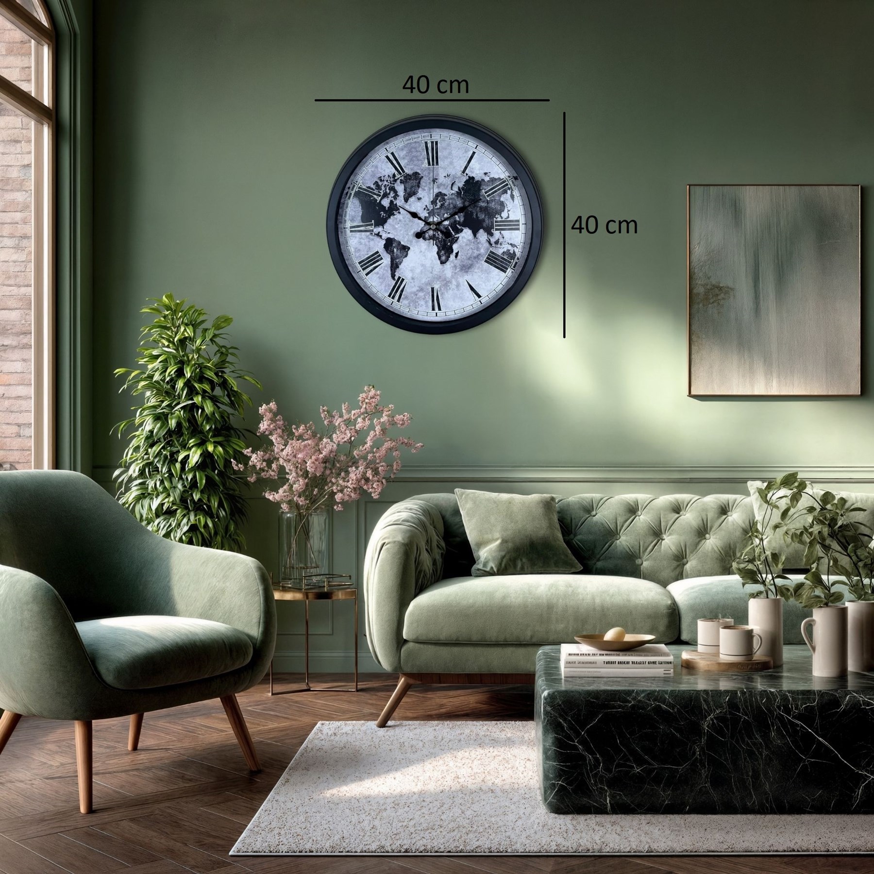 Dünya haritası desenli özel kadranı ile tasarlanan bu 40 cm siyah metal duvar saati, yaşam alanlarınıza vizyoner ve prestijli bir atmosfer kazandırır. Roma rakam detayları ile klasik şıklığı yansıtırken, dünya haritası tasarımı modern ve karakterli bir duruş sunar.