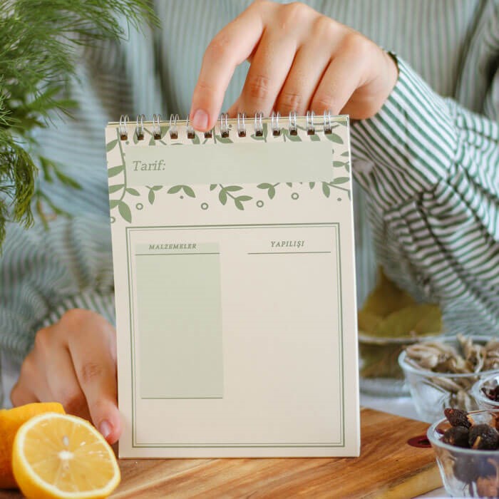 Kağıt kalemin tadı her zaman başkadır. Mutfakta vakit geçirmeyi seven biriyseniz tanıştıralım, yemek tariflerinizi düzenli bir şekilde not alabileceğiniz, tatlı bir yeşil defter. Sayfalarda, tarifin adı, malzemeleri ve yapılışı için özel alanlar bulunuyor.Kalın ve kaliteli kağıttan üretilmiştir. Tamamen geri dönüşümlü malzemedir. 50 yaprak = 100 sayfadan oluşmaktadır Üst kısmı metal spirallidir. Boyutları : 12*17cm.