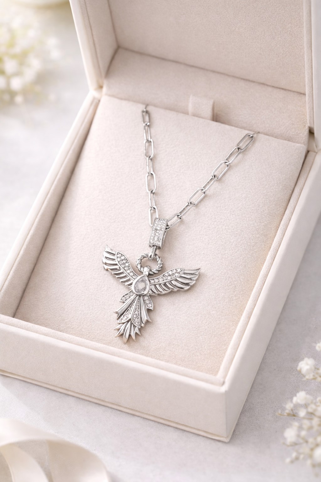 Zirkon Taşlı Anka Kuşu Figürlü Ataç Zincir Çelik Kolye MODEL 12 – Kararmaz, Güç ve Yeniden Doğuş Sembolü