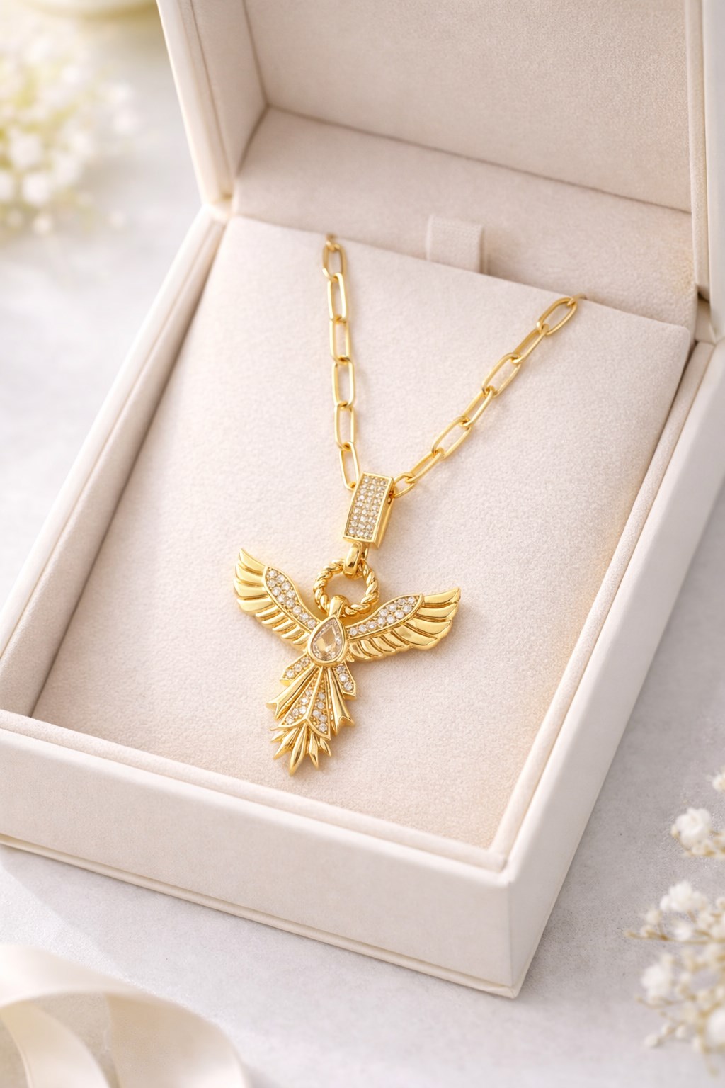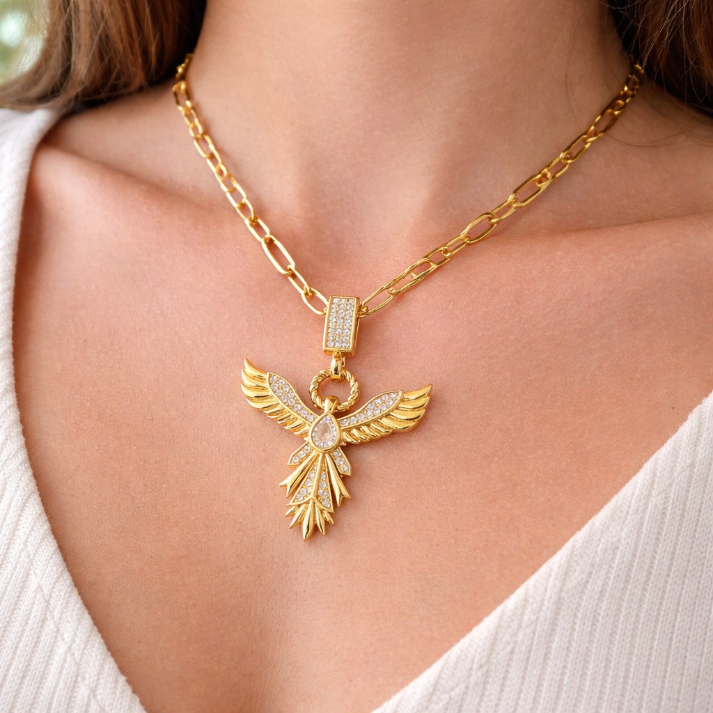 Zirkon Taşlı Anka Kuşu Figürlü Gold Ataç Zincir Çelik Kolye MODEL 13 – Kararmaz, Güçlü ve Şık Tasarım