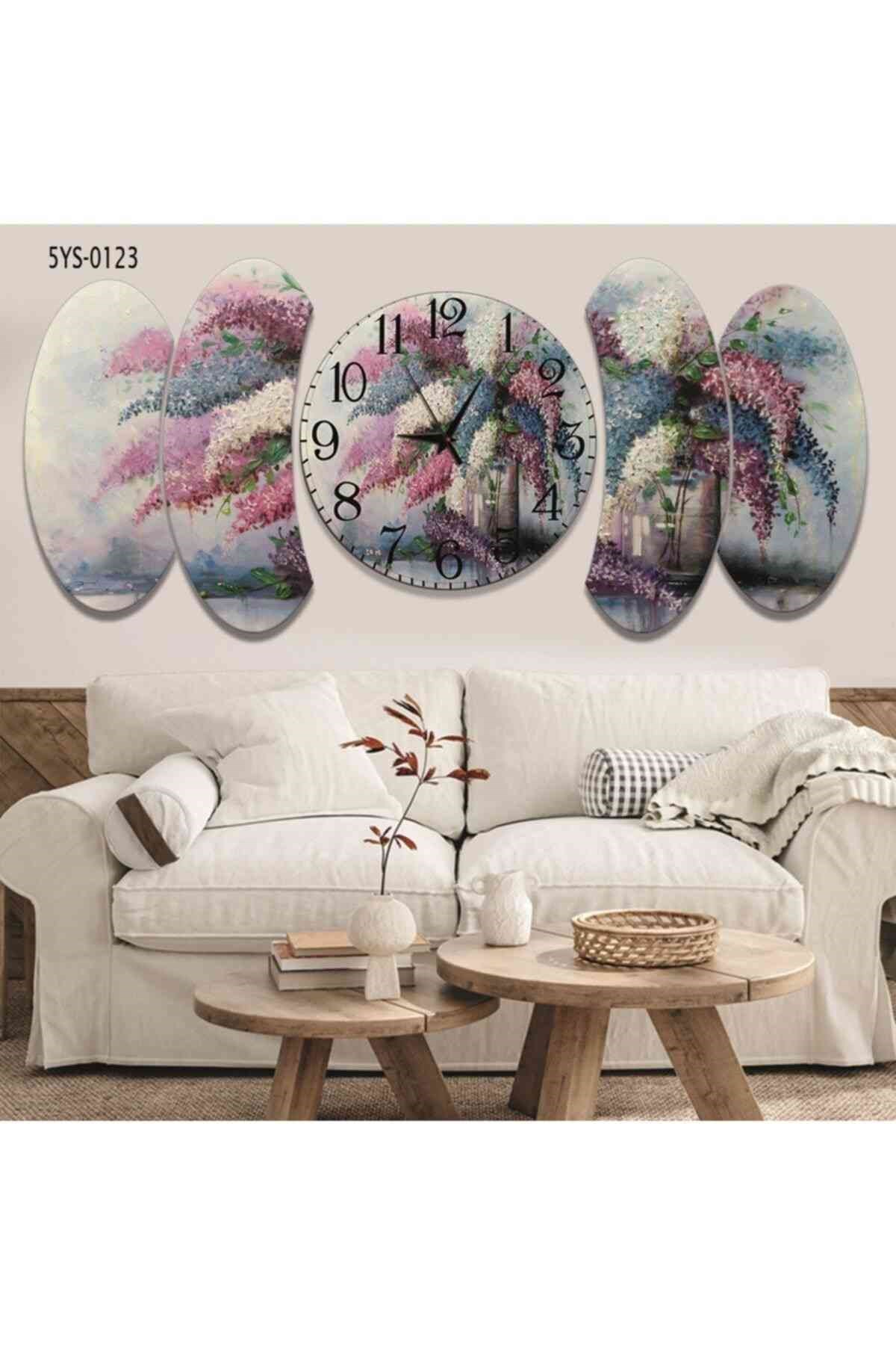 5 Parça Çiçek Aranjman Tasarım Saatli Mdf Tablo