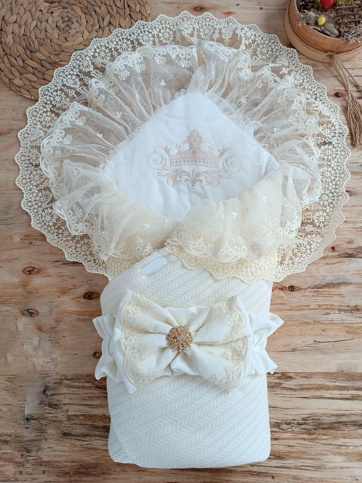 Örgü Tericotton Taç Nakışlı İncili Güpür Çift Fiyonk Papatya Güpür Trilüks Kundak Bebek Battaniyesi
