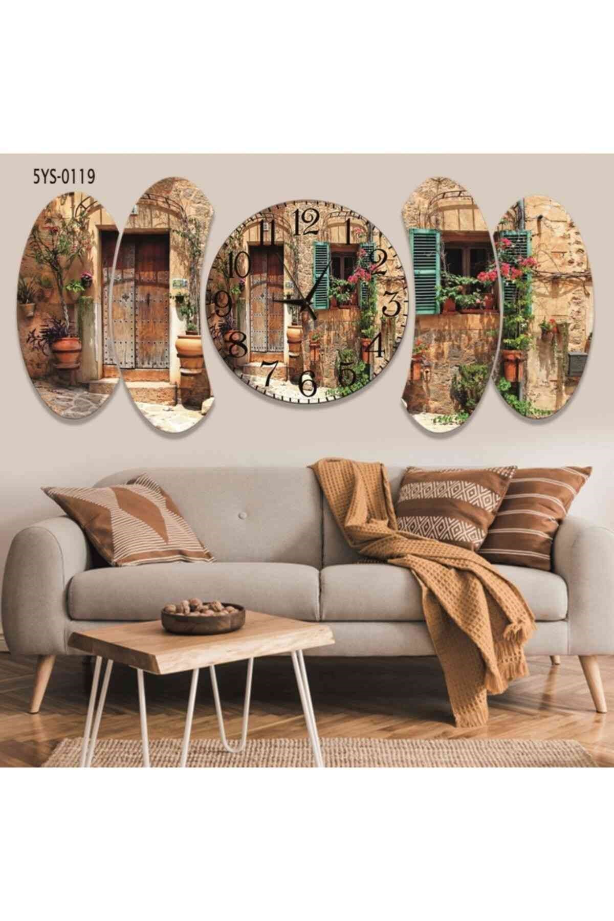 5 Parça Alaçatı Manzarrası Tasarım Saatli Mdf Tablo