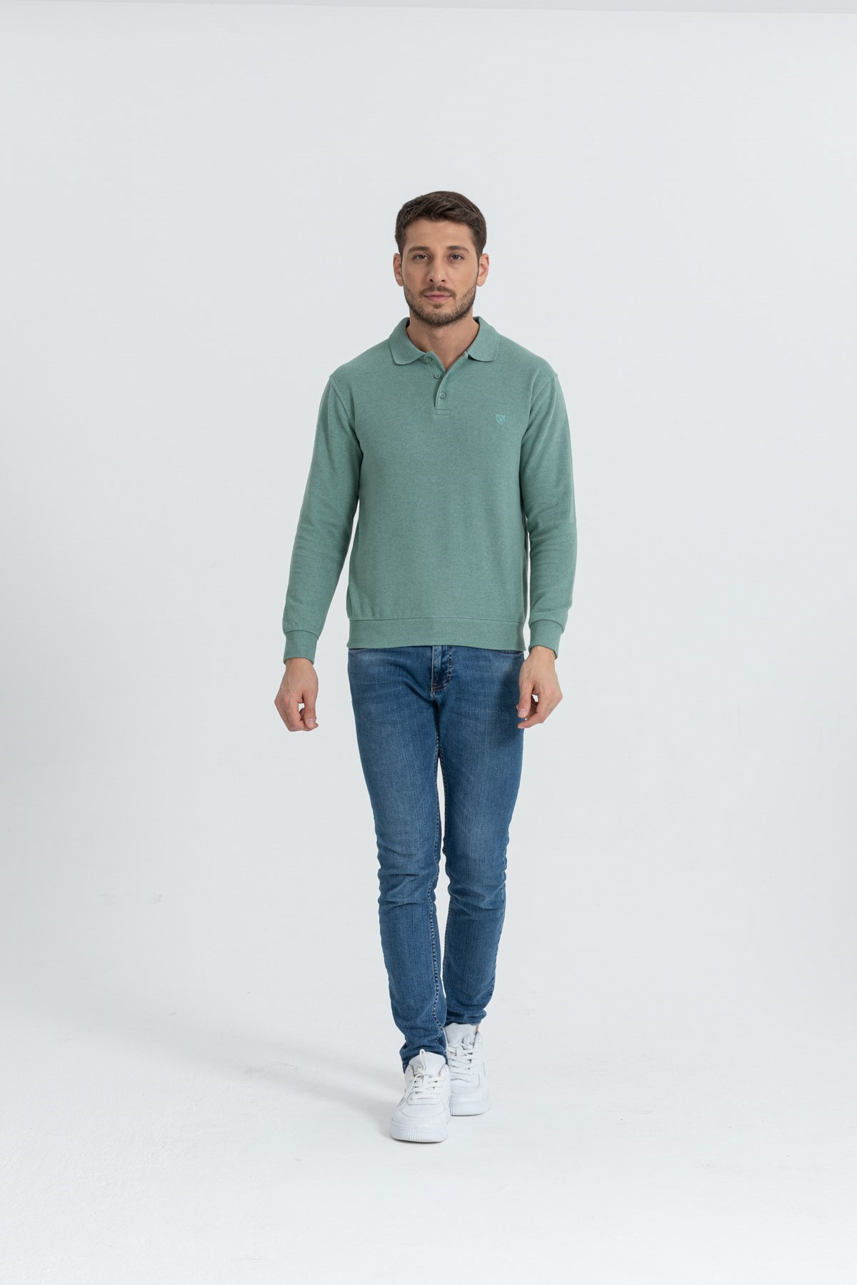 Erkek Çağla Yeşili Polo Yaka Standart Fit Normal Kesim Sweatshirt