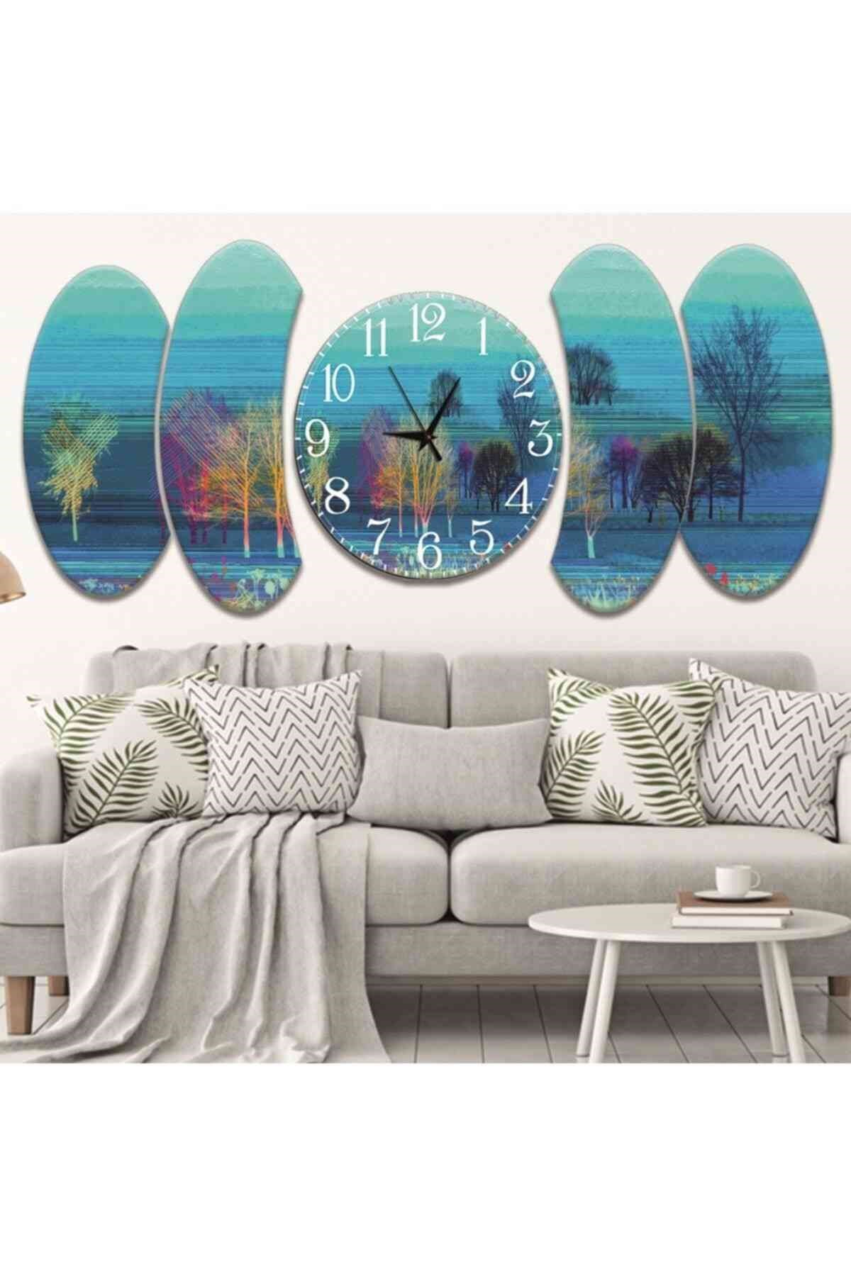 5 Parça Illüstrasyon Çiçek Tasarım Saatli Mdf Tablo