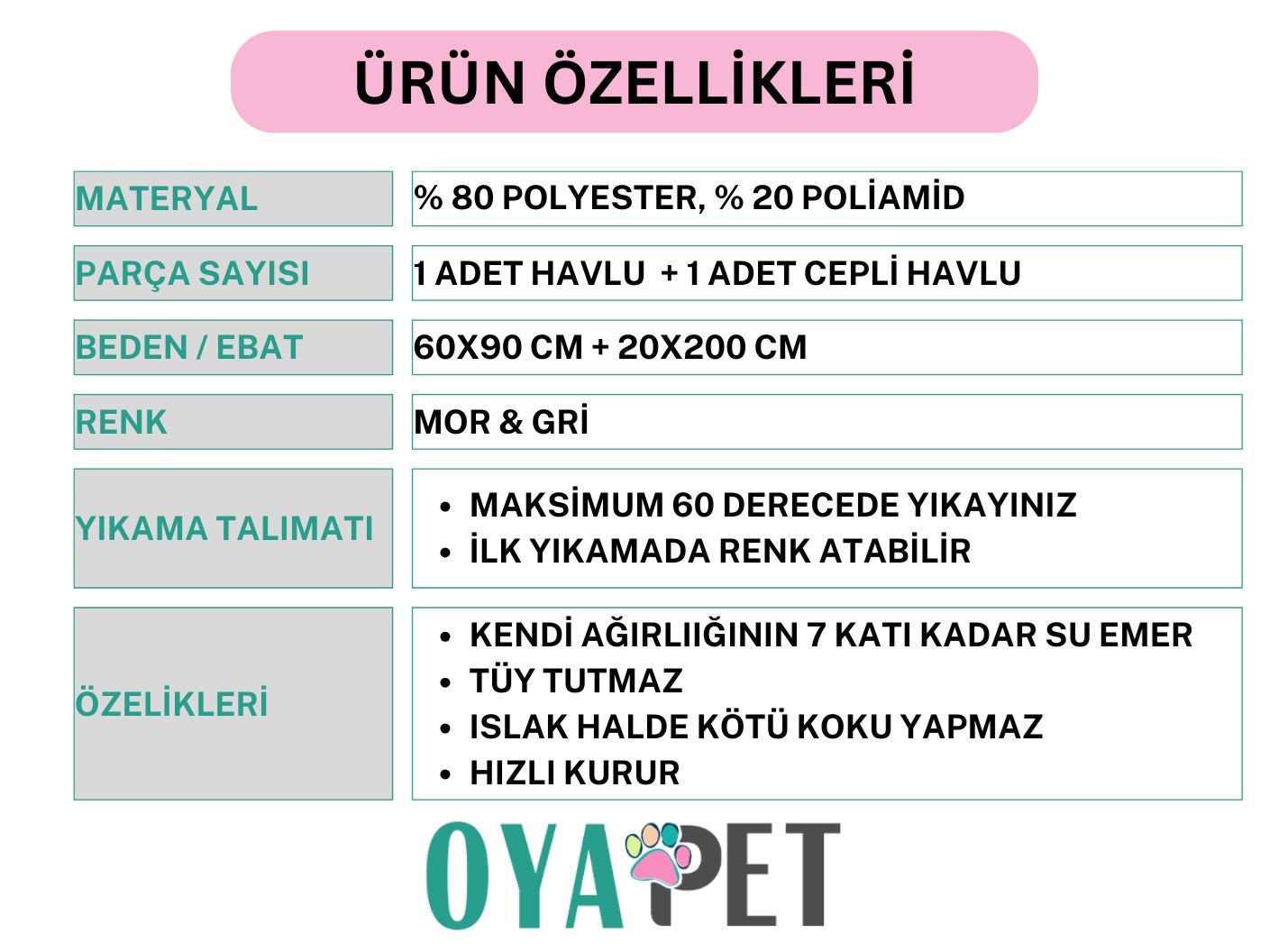 Renk : Gri Eldiven ve Mor Havly ; Ebat: 20x100 cm (Eldiven) + 60x90 cm (Havlu) ; Malzeme : % 80 Polyester % 20 Poliamit ; Bakım Talimatı : 60 dereceye kadar makinada yıkama imkanı. ; Marka : OYA PET ; ; Can dostlarımızın en hassas yeri olan patilerini zararlı olabilecek ıslak mendillerden kurtarmak için ve doğanın bize sunduğu en saf bileşen olan suyla temizleyip pati için özel geliştirdiğimiz havluyla kurulamak için tasarladık. İki adet cebi ve tasarımı sayesinde pati aralarını bile temizleyip kolaylıkla kurulayabilirsiniz. Köpeğinizin pati sağlığını korurken sürdürülebilir bir hayat ve doğa fayda sağlayabilirsiniz !? Normal havlulara kıyasla 7 kat fazla su ve kir emer. ? Derinlemesine Pati temizliği için özel olarak tasarlanmıştır. Suyla temizleyin ve parmak aralarına kadar kurulayın ! ? Islak kaldıktan sonra bile kötü köpek kokusu yapmaz. ? olduğu için üzerinde bakteri üremez ! ? Tüy tutmama özelliği. Ufak bir silkeleme sonucunda üzerinde tüy kalmaz. ? Suyu sıkıldığında kısa sürede kurur ve tekrar kullanıma hazırdır. 1 yıkamayla 5 kez kullanabilirsiniz çünkü ISLAK KÖPEK KOKUSU YOK ! ? Dilediğin yerde istediğin gibi kullan ! İster evde, ister sahilde hatta arabada bile. Renk : Gri Eldiven ve Mor Havlu ; Ebat: 20x100 cm (Eldiven) + 60x90 cm (Havlu) ; Malzeme : % 80 Polyester % 20 Poliamit ; Bakım Talimatı : 60 dereceye kadar makinada yıkama imkanı. ; Marka : OYA PET ; '' Islak Tüylere Veda, Temizliğe Merhaba ''