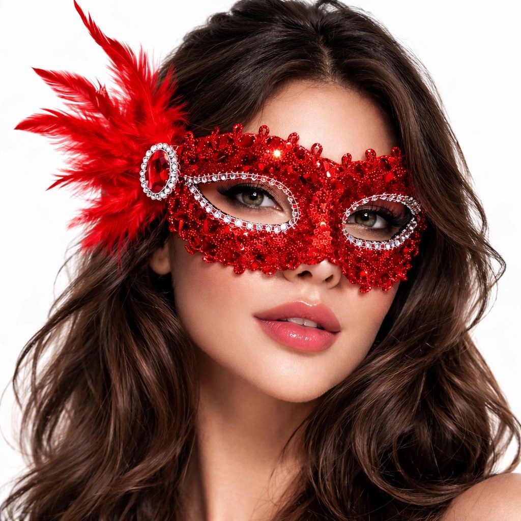 Kırmızı Taşlı Venedik Parti Maskesi – Tüylü Payetli