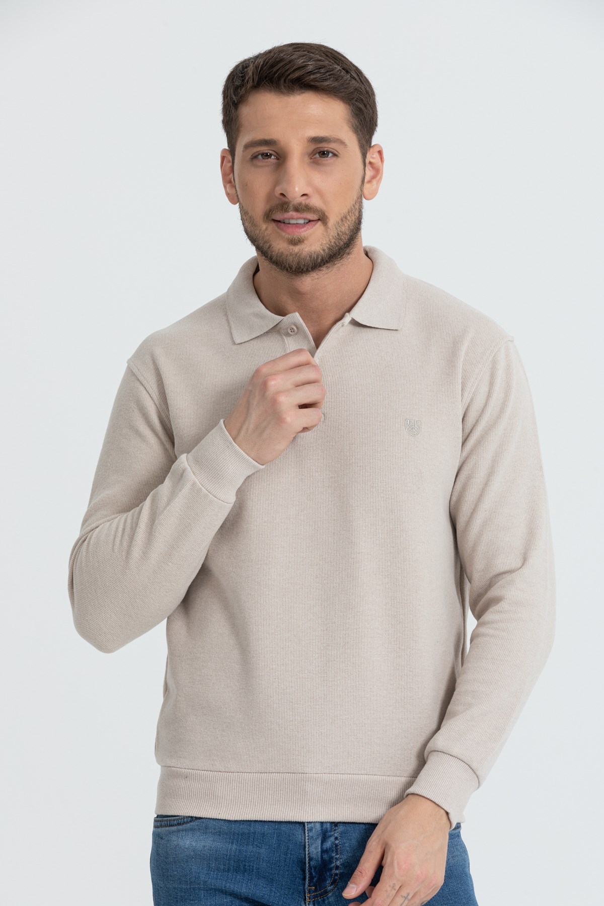 Erkek Bej Polo Yaka Standart Fit Normal Kesim Sweatshirt